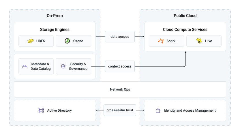 In this hybrid model, data is physically stored in the on-premise infrastructure (e.g., HDFS or Ozone), while processing takes place in the public cloud (e.g., using Apache Spark, Hive, or Impala). Although compute runs in the cloud, the data source remains on-premises. Workloads submitted to the cloud directly access on-premise data. The workload execution plan dictates the strict data subsets that are leveraged in cloud for processing without creating data copies.
