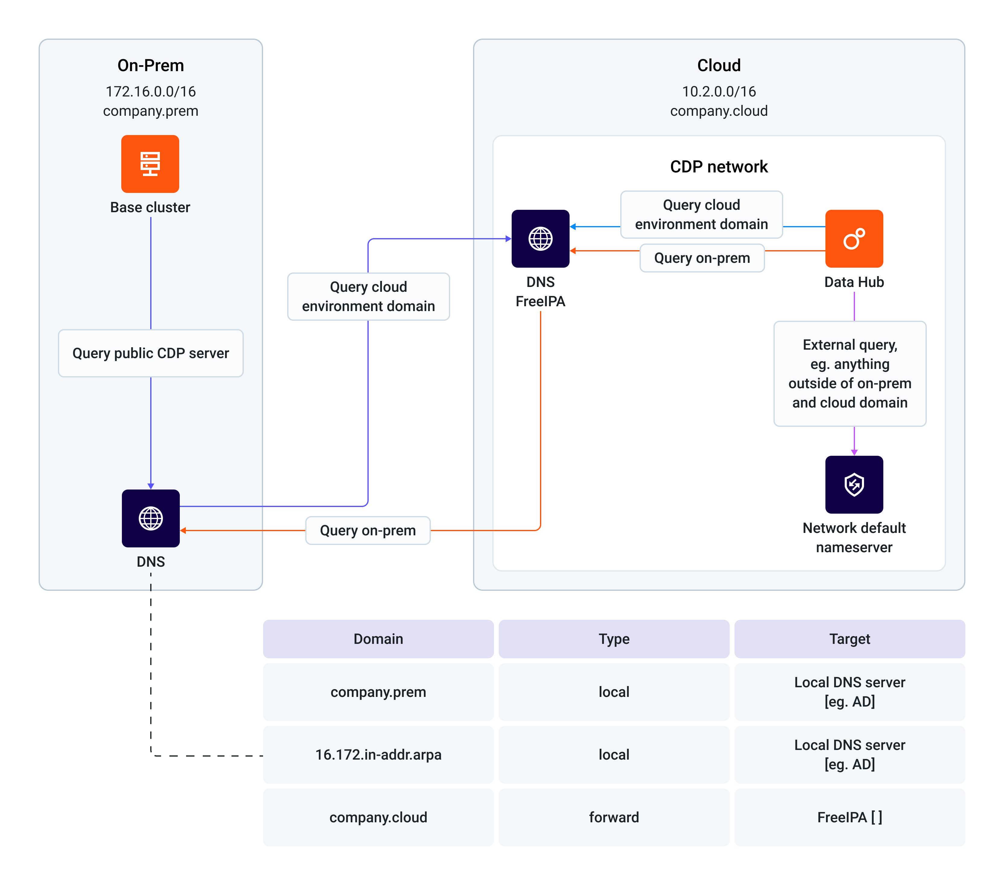 - The On-premise DNS has a conditional forwarding rule (as shown in the configuration table) for the company.cloud domain.