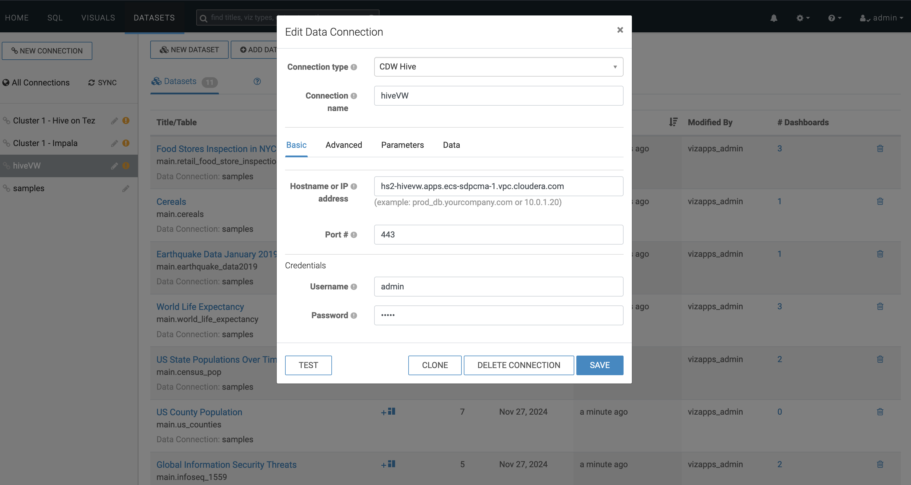 Starting Cloudera Data Visualization on premises for Hive and Impala Virtual Warehouses