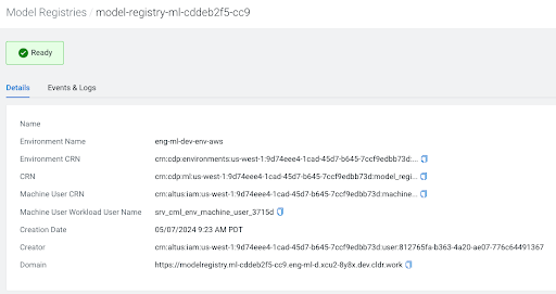 - Click on the name of the Cloudera AI Registry to display the Cloudera AI Registry information. The Domain name is
