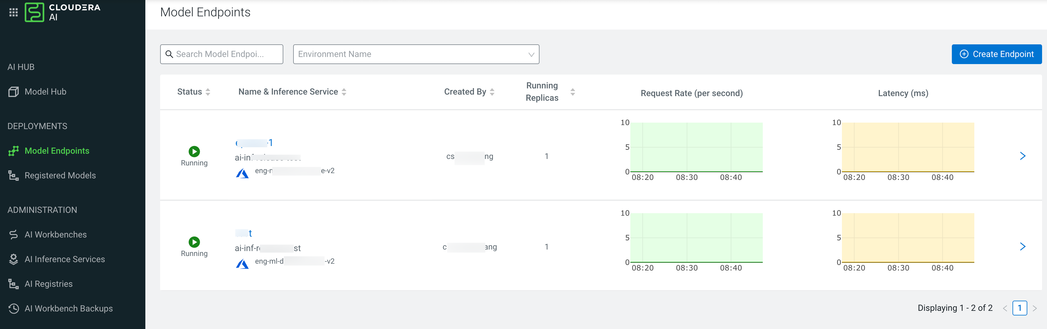The Model Endpoints landing page displays a table view that represents a comprehensive list of all the model endpoints across the running Cloudera AI Inference service instances in your Cloudera account.