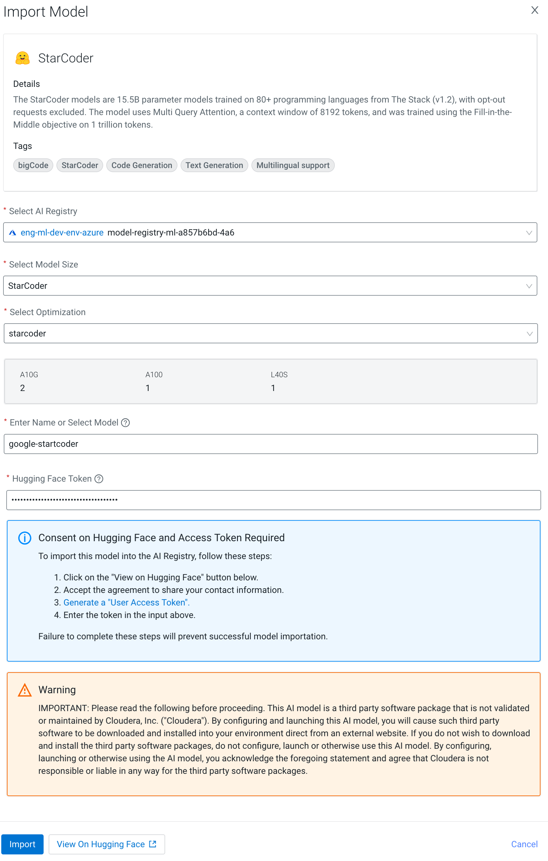 You can import the Hugging Face models listed on the Model Hub page into your Model Registry. If your preferred model is not listed on the Model Hub page, you can import it from the Registered Models page. After you import the model, the newly imported model will be listed on the Registered Models page.