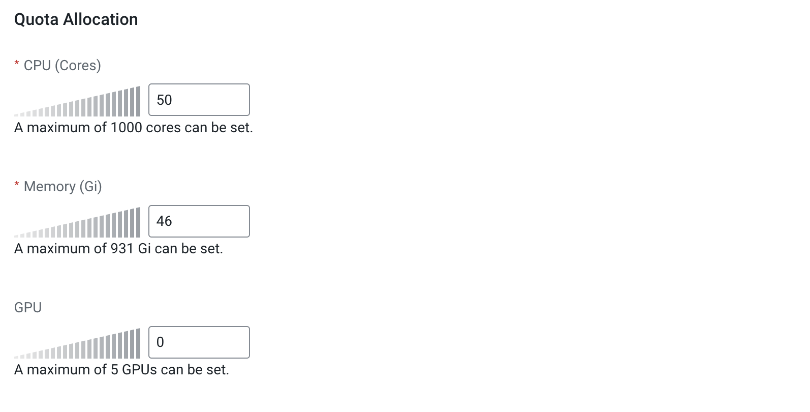 In this example out of 100 Cores and 100 GB, 50 Cores and 46 GiB will be reserved for the Cloudera AI Workbench.