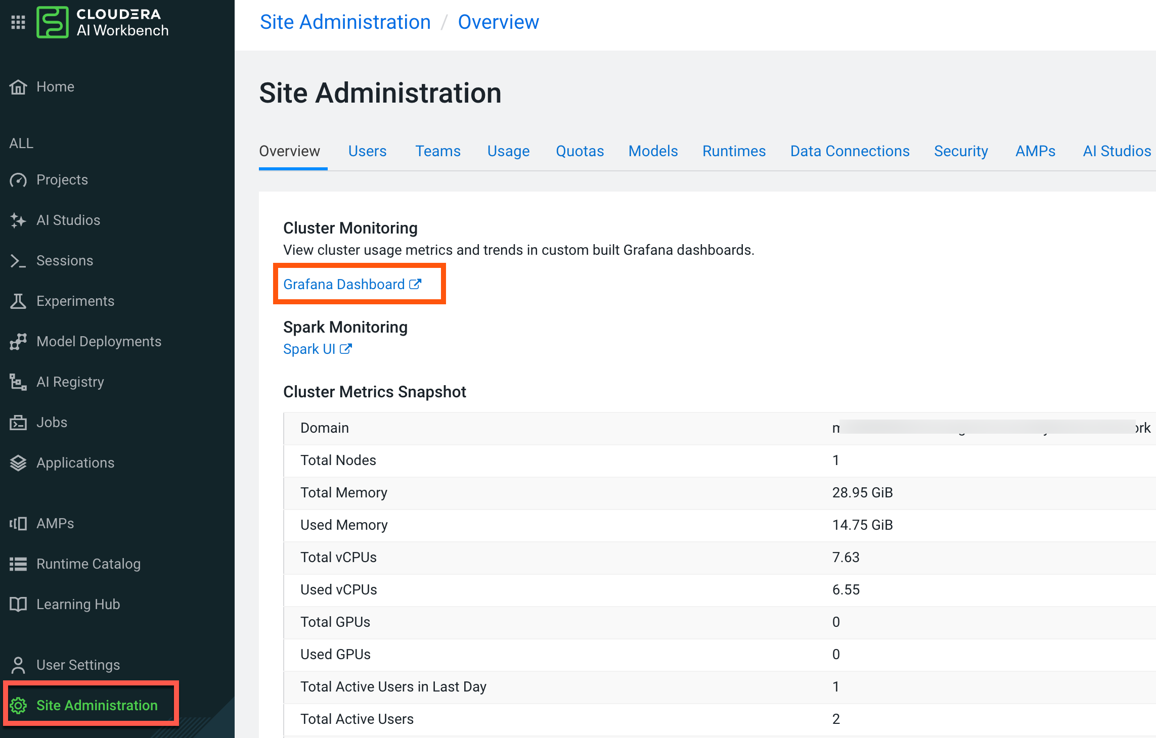 resource consumption data from Prometheus. By default, Cloudera AI provides three Grafana dashboards: