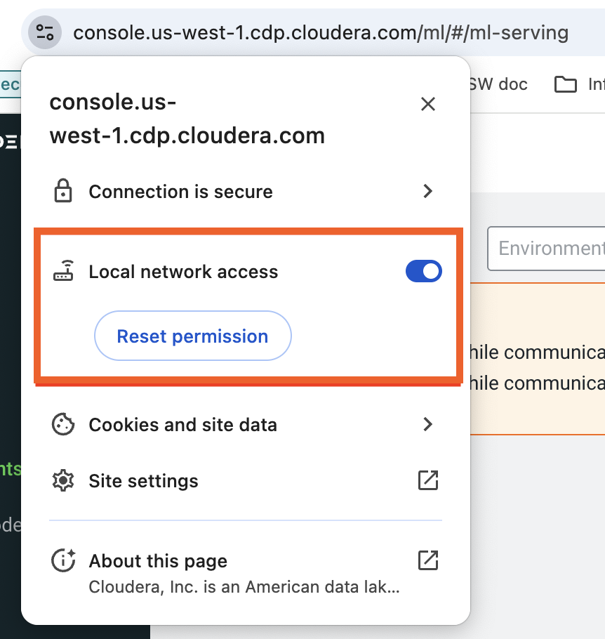unknown address space.- Grant Private Network Access: Ensure your browser (Google Chrome v142 or higher) grants Private Network Access (PNA) to the Cloudera Control Plane.