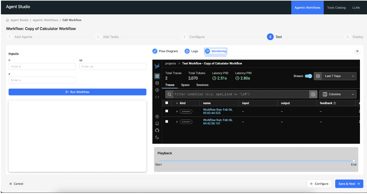 The monitoring feature is available while testing a workflow. You can create a new workflow of edit and deploy a workflow.