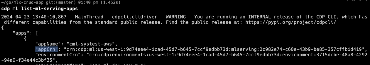 cdp ml list-ml-serving-appscommand. - Find the appCrn of the ML Serving instance you