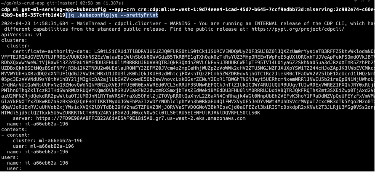 cdp ml get-ml-serving-app-kubeconfig --app-crn <YOUR-APP-CRN> : returns raw json response containing