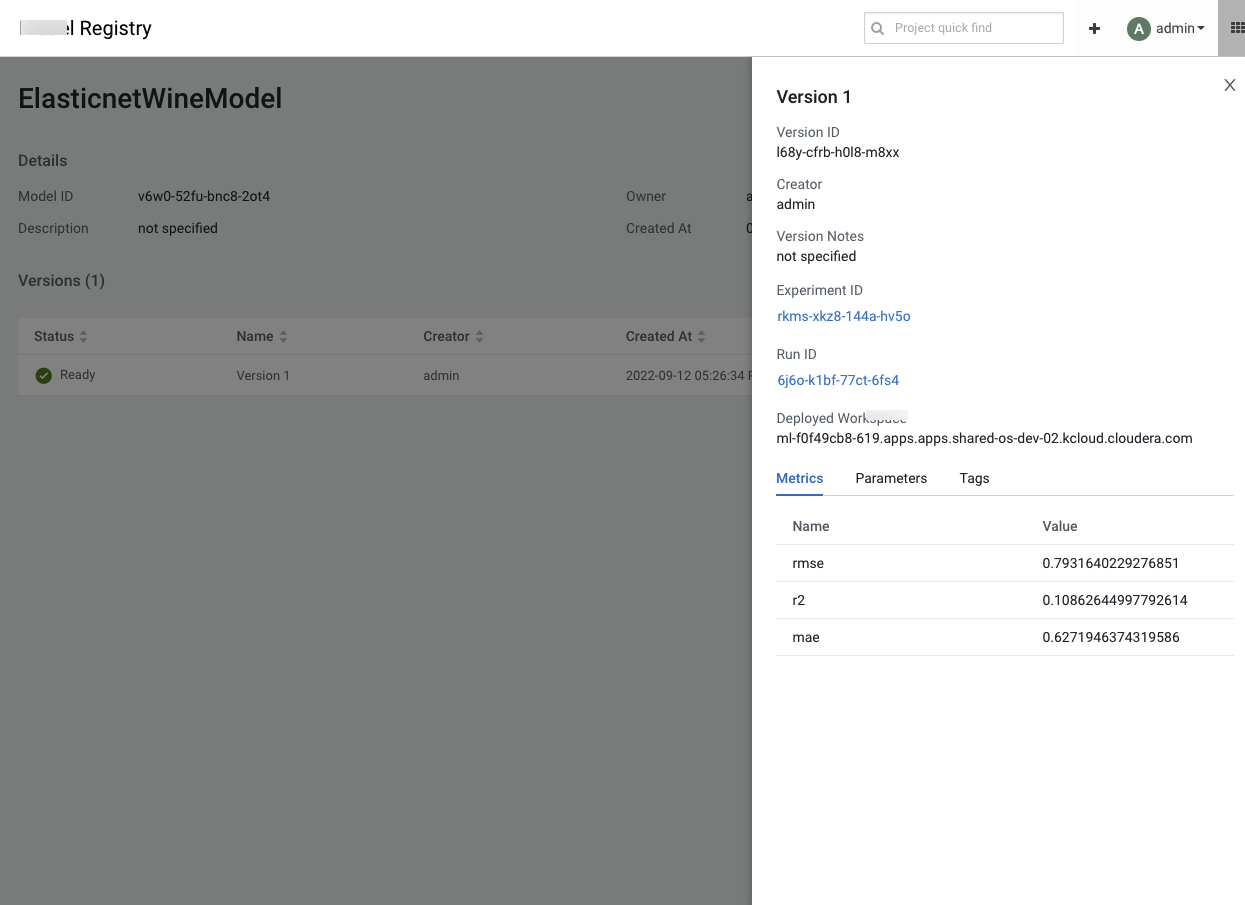 Cloudera AI displays the Details page which outlines the model description, ID, owner, and versions. Different versions of the same model can be deployed in the workbench.