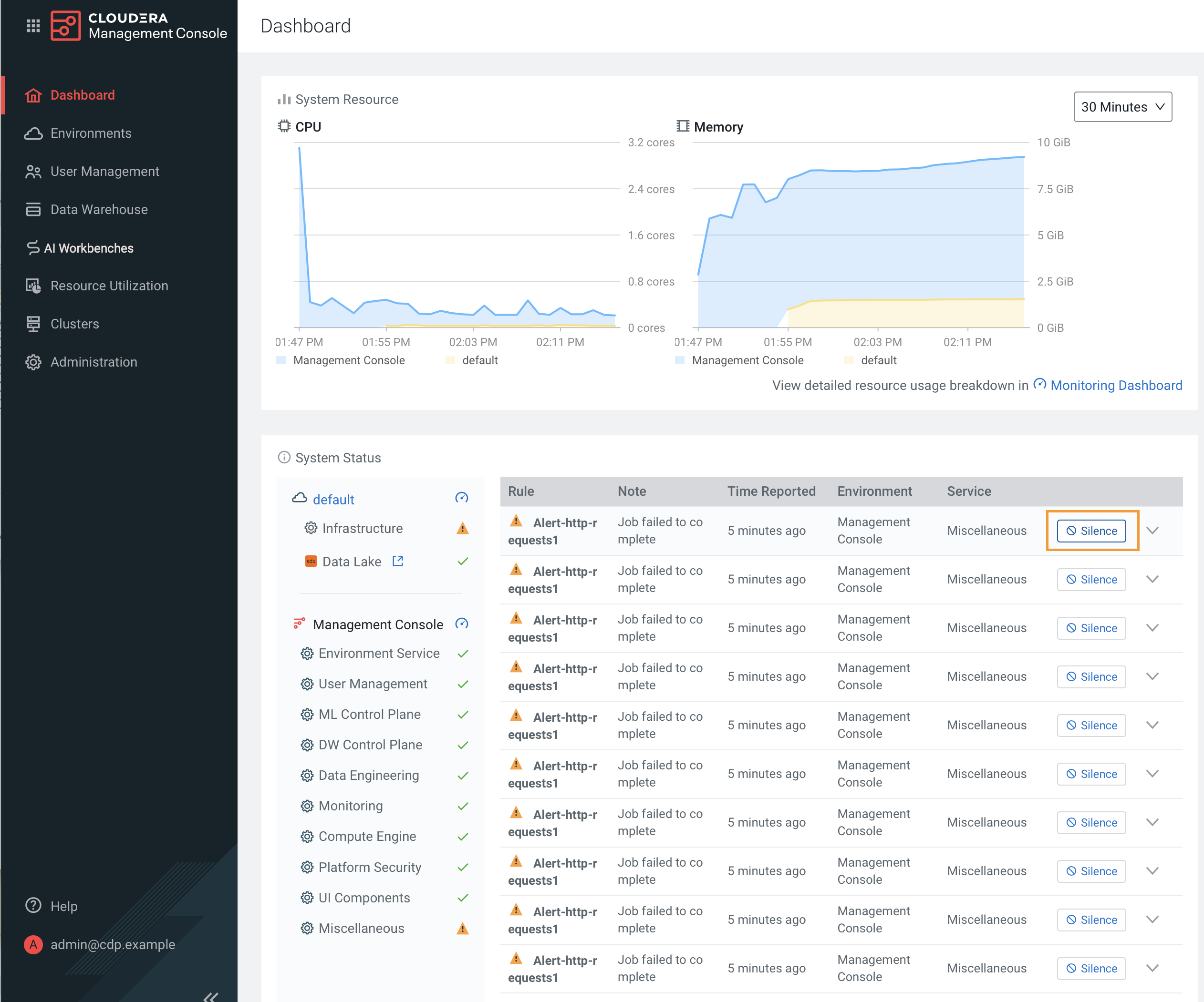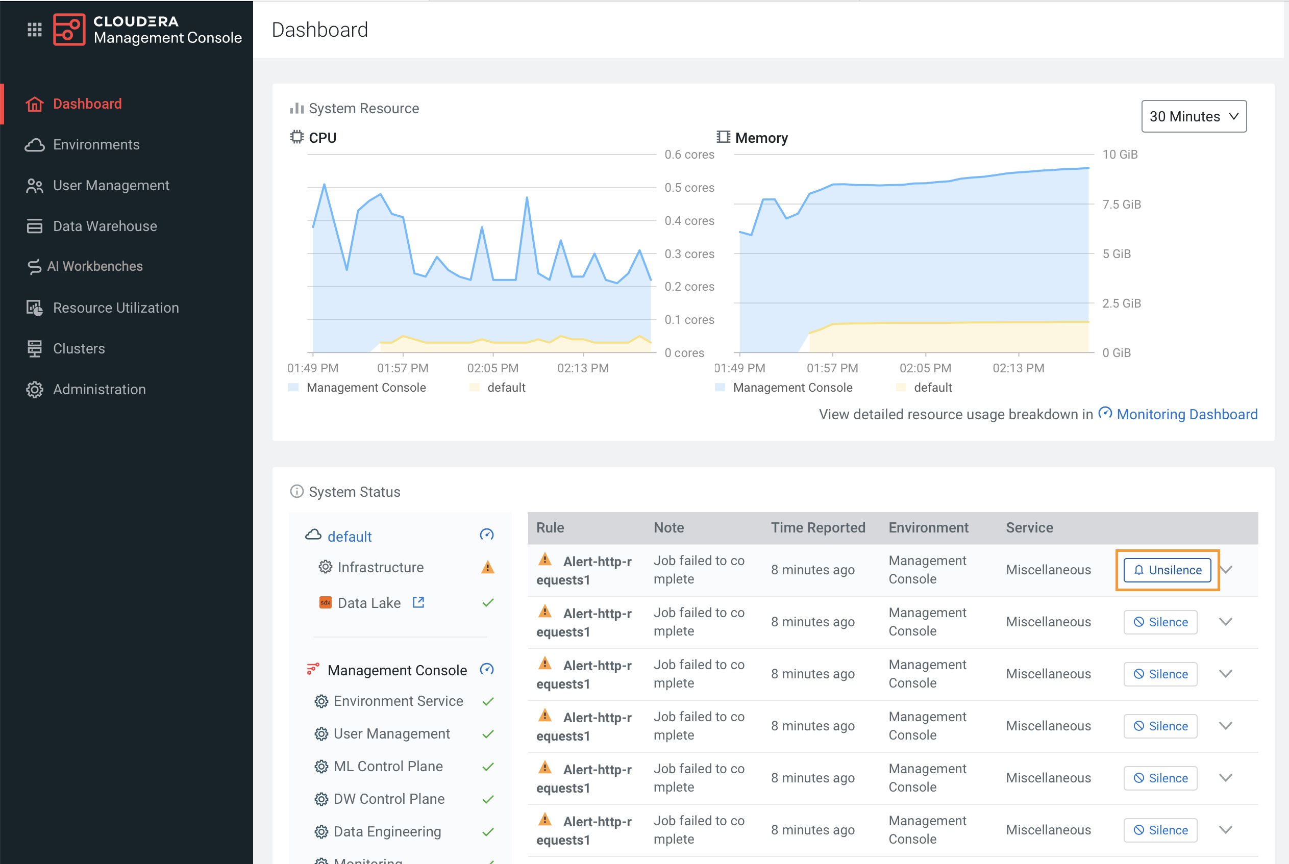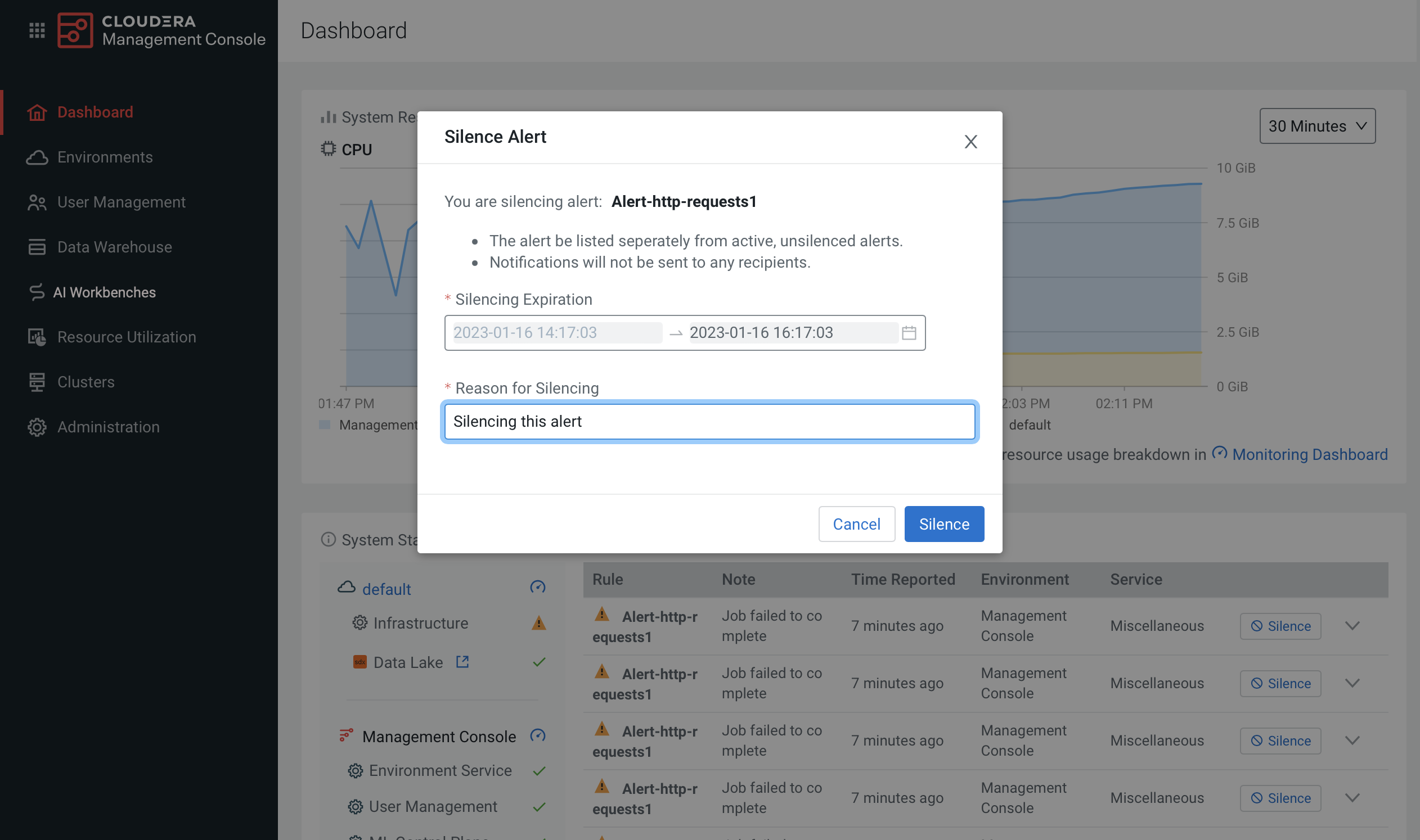 Problems that arise can trigger alerts that persist on the Cloudera Management Console dashboard until the cause is resolved (depending on the alert rule configuration). You can use alert silencing to avoid repeated alert pings while troubleshooting issues.
