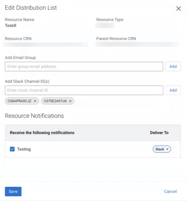 After subscribing to a resource notification, you can add Slack as a delivery channel to an existing or newly created Distribution list.