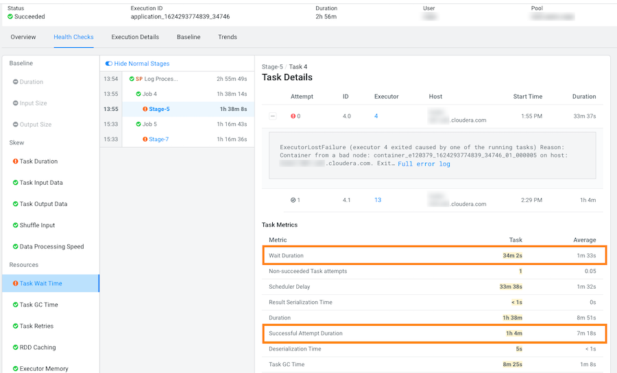 In the following example, the Task Metrics section shows higher than average criteria measurement results and the Task Details reveal an ExecutorLostFailure error. This indicates a probable memory issue, where the container is exceeding the memory limits. In this case, more details may be found by clicking Full error log and reviewing the log:
