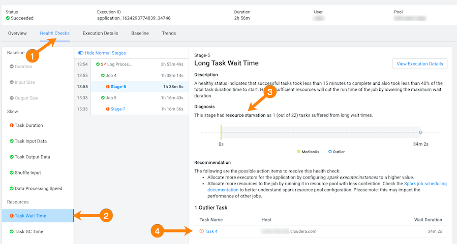 In the following example, the long wait time occurred in Stage-5 of the job process due to insufficient resources. The Recommendation section lists items for you to complete that may resolve the problem and the specific outlier tasks that produced the unusual results: