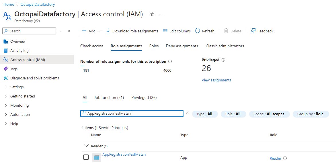 - A dedicated application registered with the 'Reader' role assigned to the relevant Data Factories.