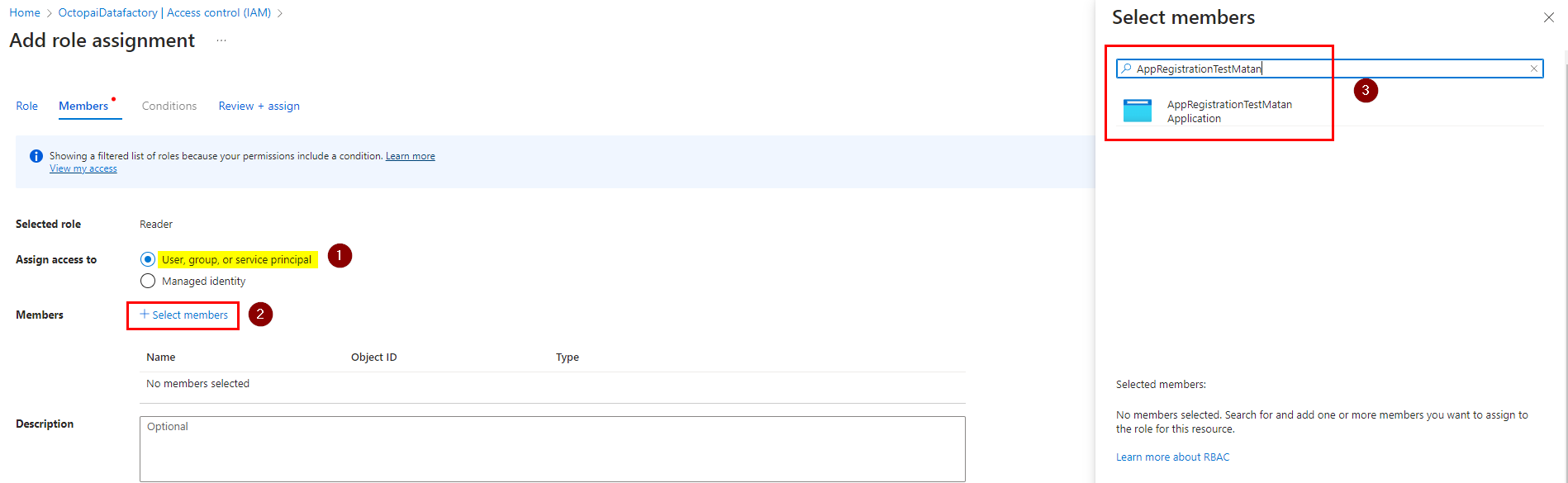 - Under the 'Members' tab, choose 'User, group, or service principal' and click on '+