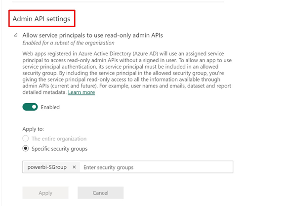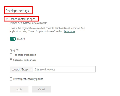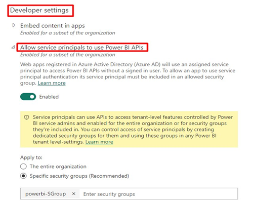We need to enable the following: Under Tenant settings go to Developer Settings. Enable “Embed content in apps” and “Allow service principals to use Power BI APIs”. Choose the security group that the Service Principal is in.