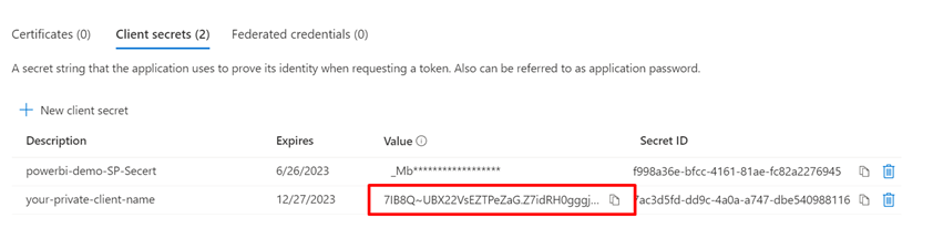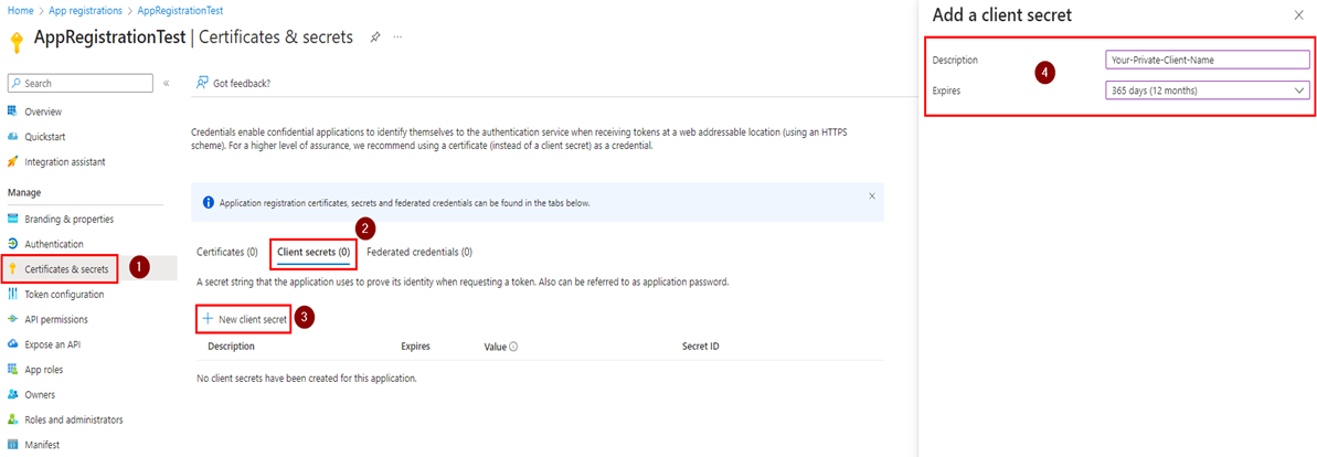 In the Azure portal, go to Certificates & secrets > New client secret.