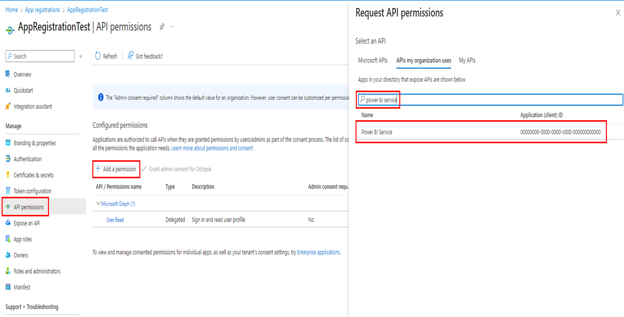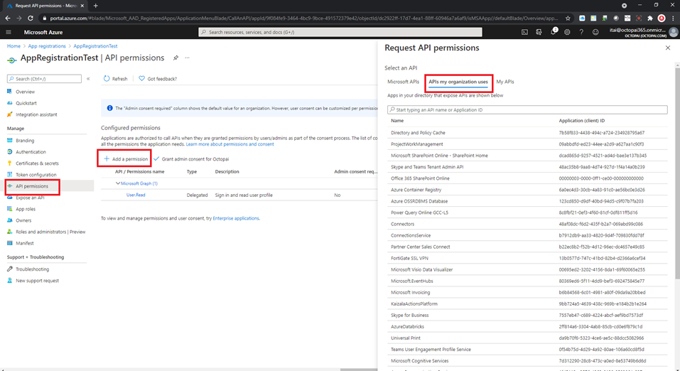 Click the API Permissions tab > Click Add permission > Click APIs my organization uses.