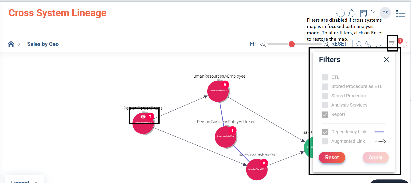 - Stable Map Filters – If your analysis is focused on a specific path, filters cannot be activated. This ensures the stability of the map, as any filter changes can trigger a map recalculation. For optimal results, Cloudera Octopai advises users to configure filters before applying focused path analysis.