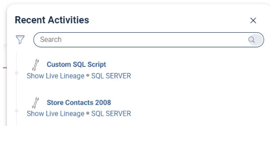 Navigate to Recent Activities to review your work. Tasks processed through Live Lineage are labeled Show Live Lineage. Scripts derived from existing lineage retain their source names, while edited or newly added scripts appear as Custom SQL Script.