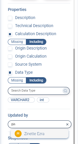 Includingfilter on a property, for example Calculation Description. - Enter a specific value in the search box.