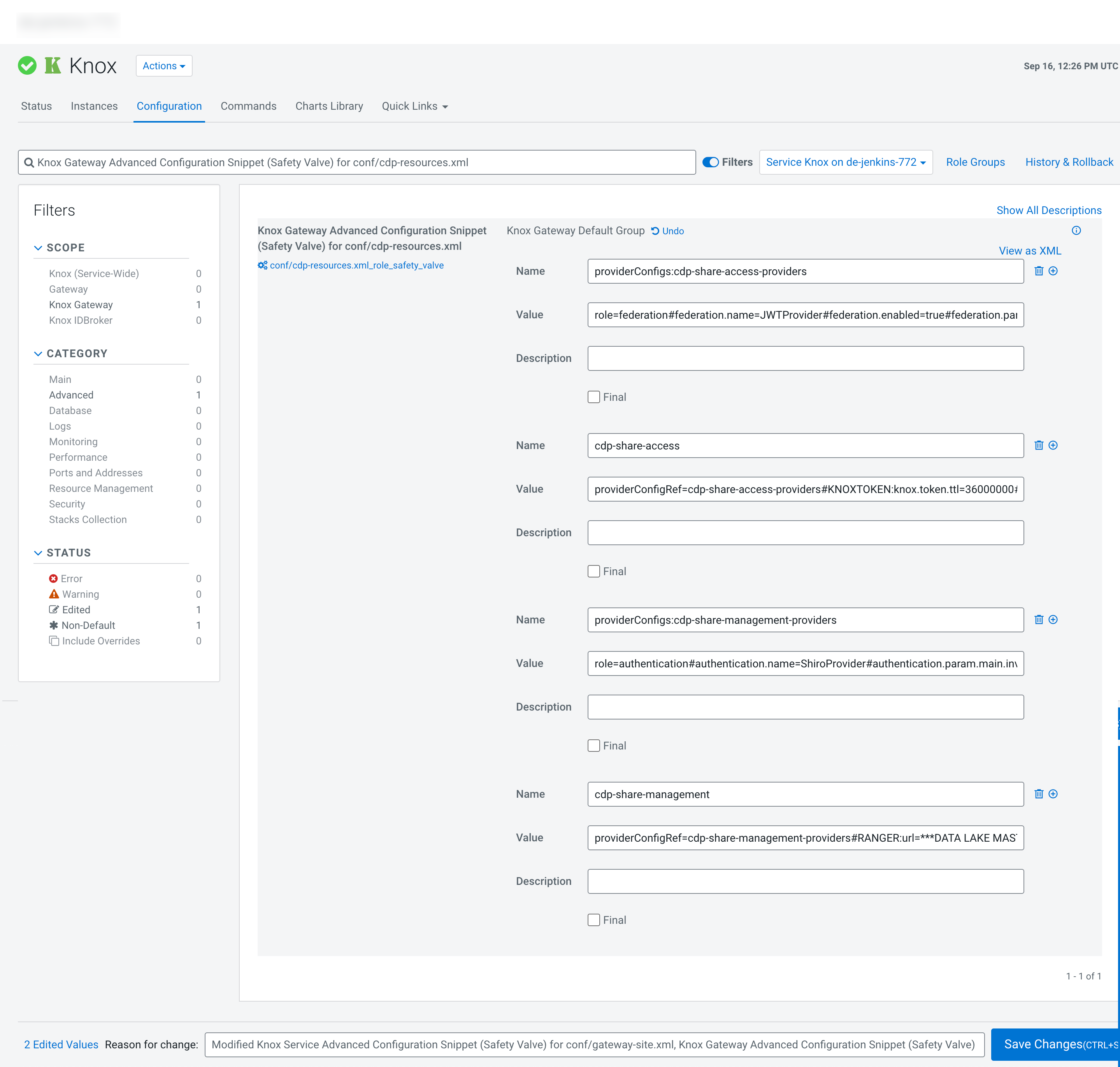 <property> <name>providerConfigs:cdp-share-access-providers</name> <value>role=federation#federation.name=JWTProvider#federation.enabled=true#federation.param.knox.token.exp.server-managed=true#role=identity-assertion#identity-assertion.name=Default#identity-assertion.enabled=true#identity-assertion.param.group.mapping.$PRIMARY_GROUP=(not(member username))</value> </property> <property> <name>cdp-share-access</name> <value>providerConfigRef=cdp-share-access-providers#KNOXTOKEN:knox.token.ttl=36000000#KNOXTOKEN:knox.token.exp.server-managed=true#HMS-API:url=http://***DATA LAKE MASTER NODE FQDN***:8090#KNOXTOKEN:gateway.knox.token.limit.per.user=-1#identity-assertion.param.hadoop.proxyuser.***USERNAME***.users=#identity-assertion.param.hadoop.proxyuser.***USERNAME***.groups=#identity-assertion.param.hadoop.proxyuser.***USERNAME***.hosts=*</value> </property> <property> <name>providerConfigs:cdp-share-management-providers</name> <value>role=authentication#authentication.name=ShiroProvider#authentication.param.main.invalidRequest=org.apache.shiro.web.filter.InvalidRequestFilter#authentication.param.main.invalidRequest.blockBackslash=false#authentication.param.main.invalidRequest.blockNonAscii=false#authentication.param.main.invalidRequest.blockSemicolon=false#authentication.param.main.pamRealm=org.apache.knox.gateway.shirorealm.KnoxPamRealm#authentication.param.main.knoxAnonFilter=org.apache.knox.gateway.filter.AnonymousAuthFilter#authentication.param.urls./knoxtoken/api/v1/jwks.json=knoxAnonFilter#authentication.param.main.pamRealm.service=login#authentication.param.sessionTimeout=30#authentication.param.urls./**=authcBasic#role=identity-assertion#identity-assertion.name=HadoopGroupProvider#identity-assertion.param.hadoop.proxyuser.impersonation.enabled=true#identity-assertion.param.hadoop.proxyuser.***USERNAME***.users=*#identity-assertion.param.hadoop.proxyuser.***USERNAME***.groups=*#identity-assertion.param.hadoop.proxyuser.***USERNAME***.hosts=*#identity-assertion.param.CENTRAL_GROUP_CONFIG_PREFIX=gateway.group.config.#role=authorization#authorization.name=XASecurePDPKnox#authorization.enabled=false#role=ha#ha.name=HaProvider#ha.enabled=true#ha.param.RANGER=enableStickySession=false;noFallback=false;enableLoadBalancing=true</value> </property> <property> <name>cdp-share-management</name> <value>providerConfigRef=cdp-share-management-providers#RANGER:url=https://***DATA LAKE MASTER NODE FQDN***:6182#KNOXTOKEN:knox.token.ttl=-1#KNOXTOKEN:knox.token.type=JWT#KNOXTOKEN:knox.token.target.url=cdp-proxy-token#KNOXTOKEN:knox.token.audiences=cdp-proxy-token#KNOXTOKEN:knox.token.client.data=homepage_url=homepage/home?profile=token&amp;topologies=cdp-proxy-token#KNOXTOKEN:knox.token.exp.tokengen.allowed.tss.backends=JDBCTokenStateService,AliasBasedTokenStateService#KNOXTOKEN:knox.token.lifespan.input.enabled=true#KNOXTOKEN:knox.token.user.limit.exceeded.action=RETURN_ERROR#KNOXTOKEN:knox.token.exp.server-managed=true</value> </property>Figure 1. Knox topology parameters in the configuration editor after pasting as XML