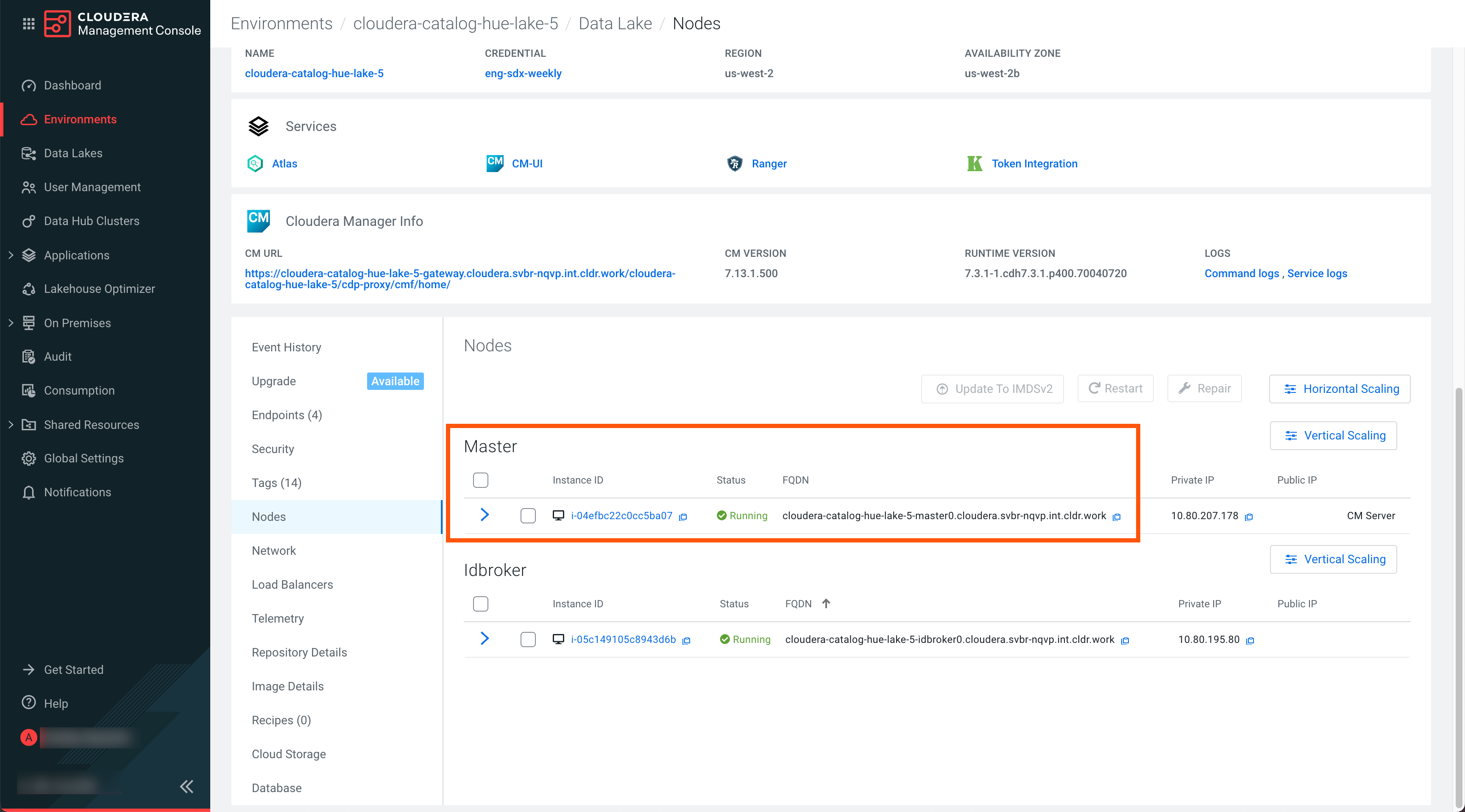 - HMS Host and Ranger Host: To get the HMS Host and Ranger Admin Host, go to Data Lake > Nodes, and copy the FQDN of the Master node.