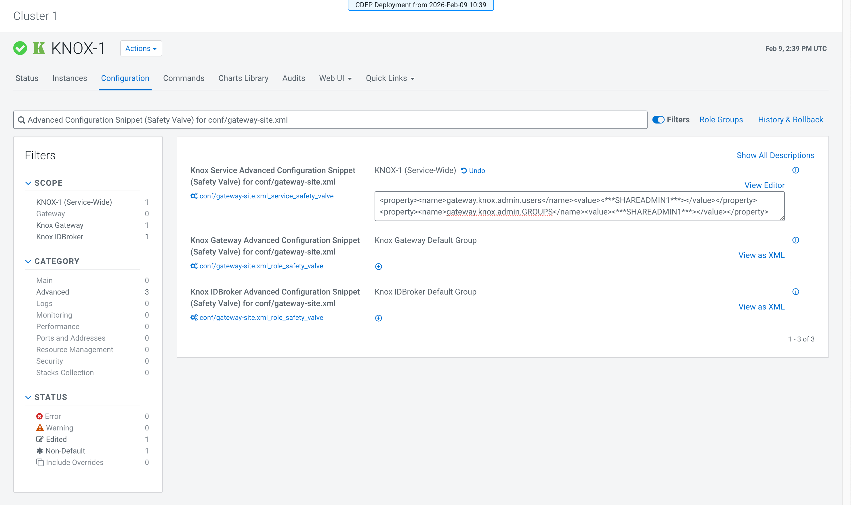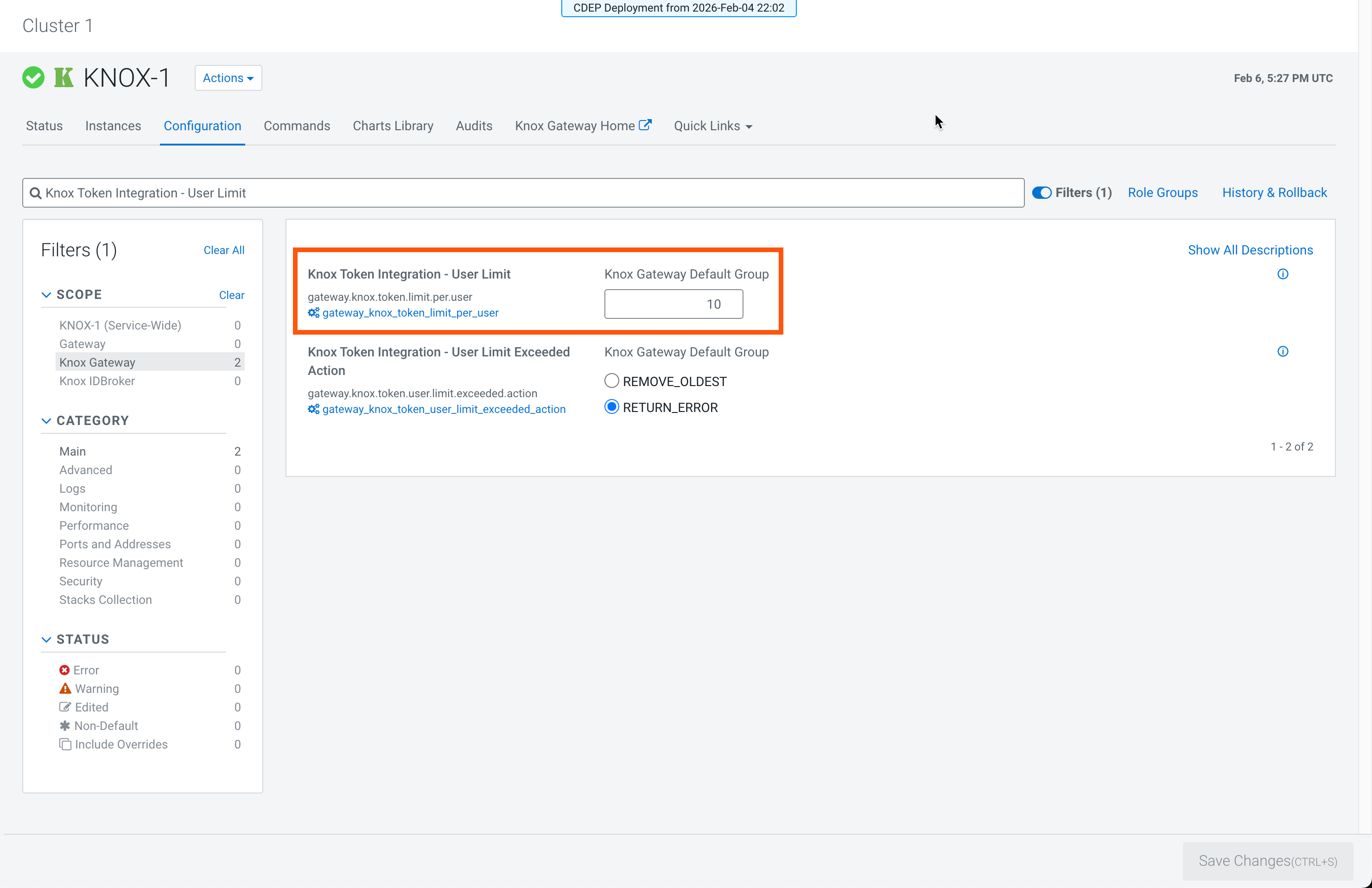 - The Cloudera on cloud user must be configured as both Knox and Ranger Admin to perform the tasks required to configure Knox parameters.