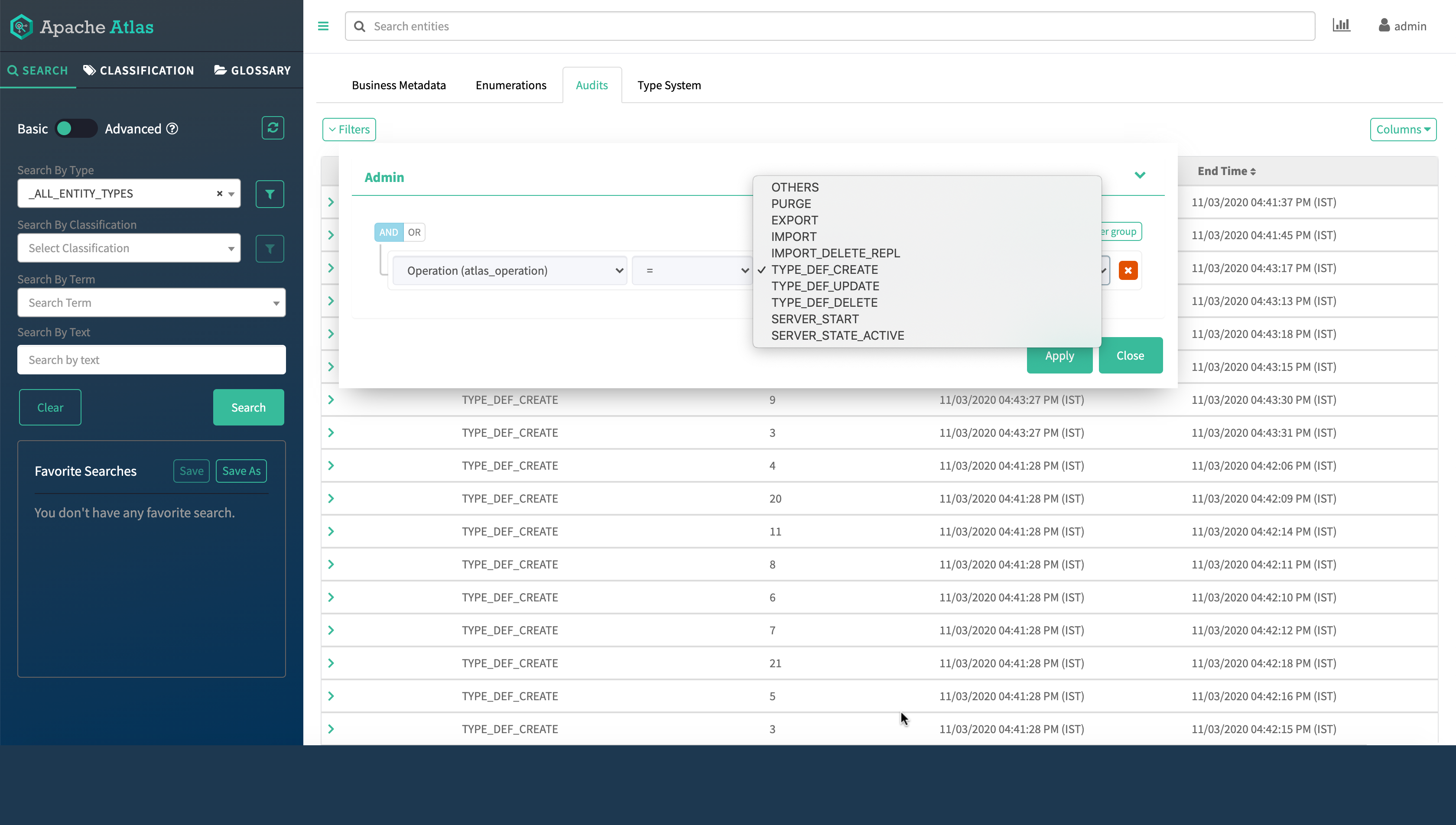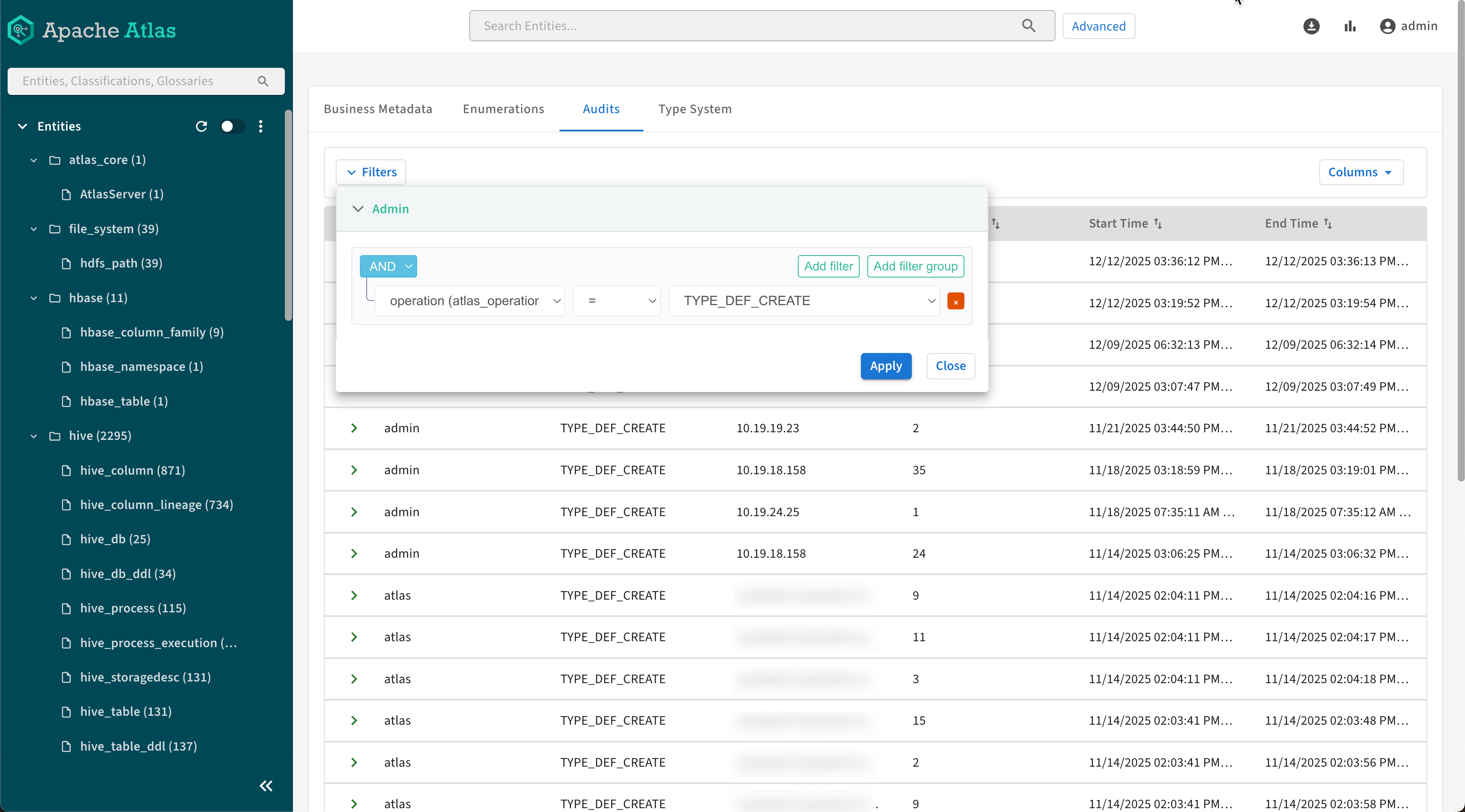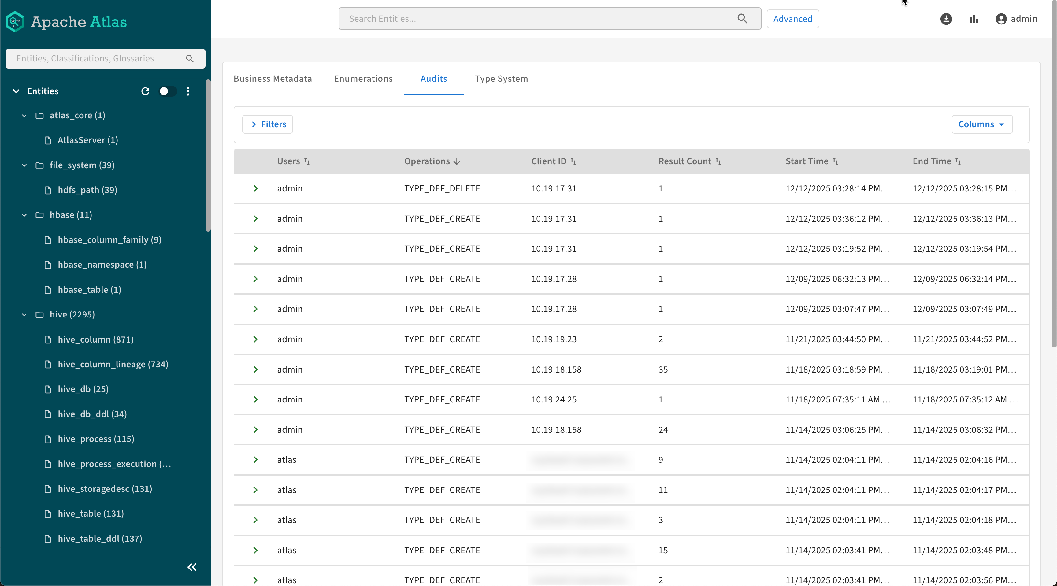 As an Atlas administrator you can view the audit operations listed in the Audits tab in the Atlas user interface. The audit data is captured implicitly by Atlas for various operations.