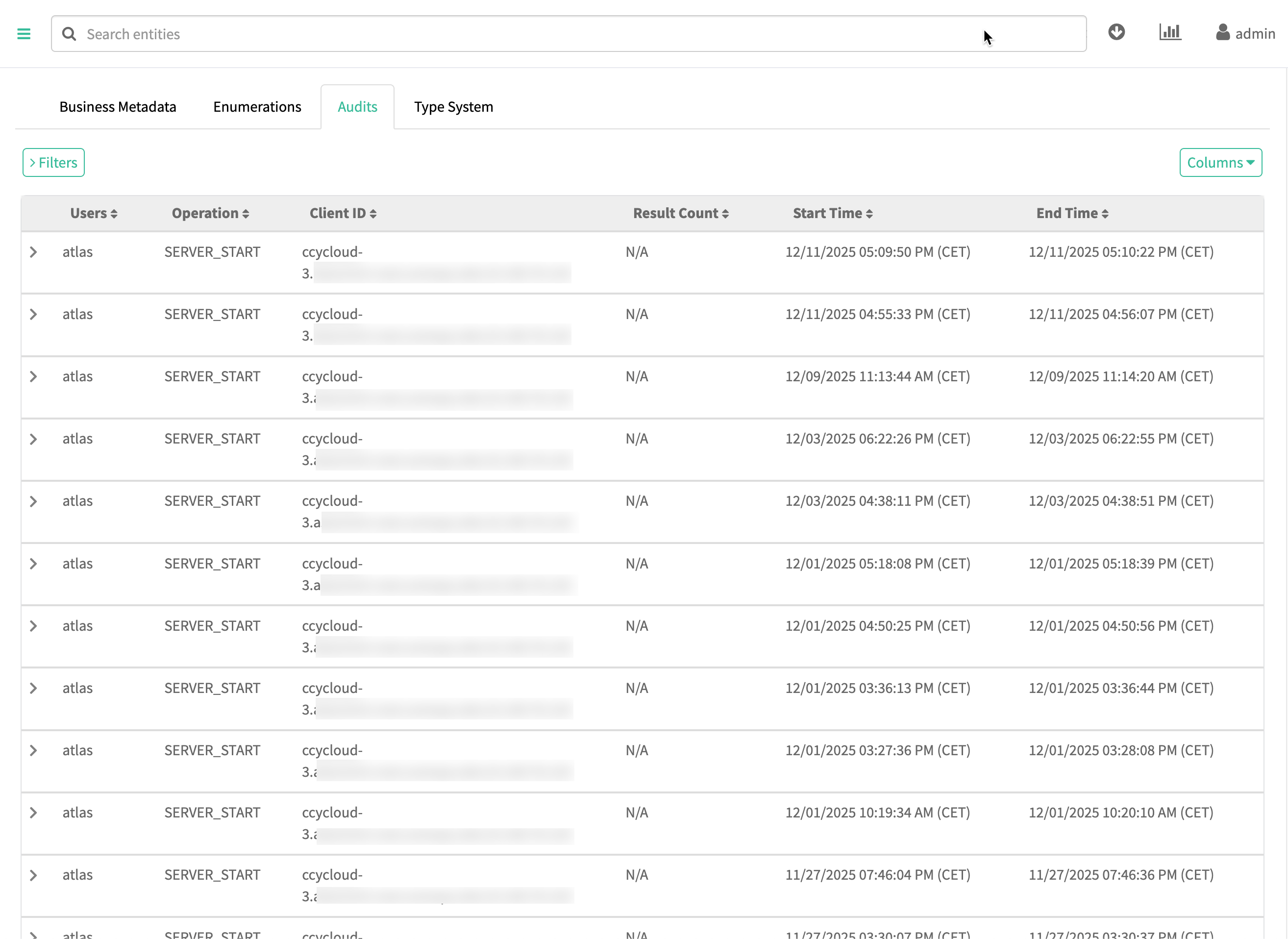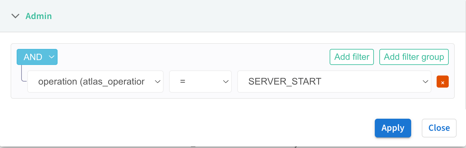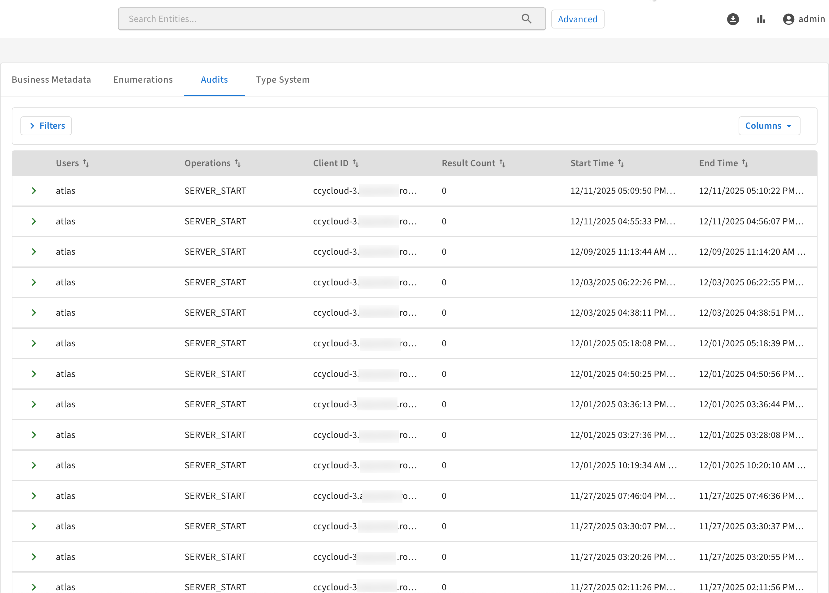 When the Apache Atlas server is started, an audit entry is logged. Also, when the server is started in the Active mode using High Availability (HA), an audit entry is logged. For more information, see About Atlas High Availability.