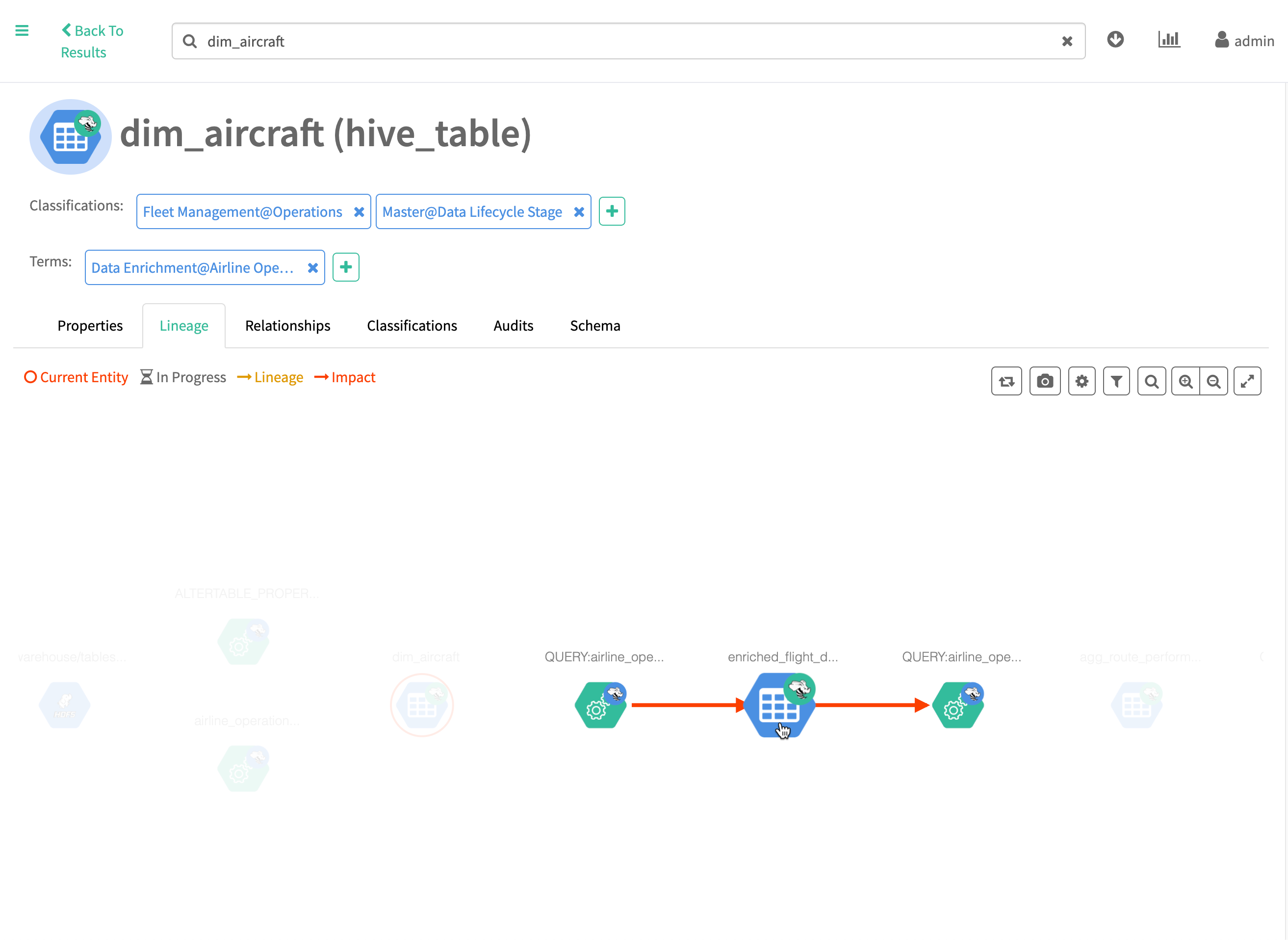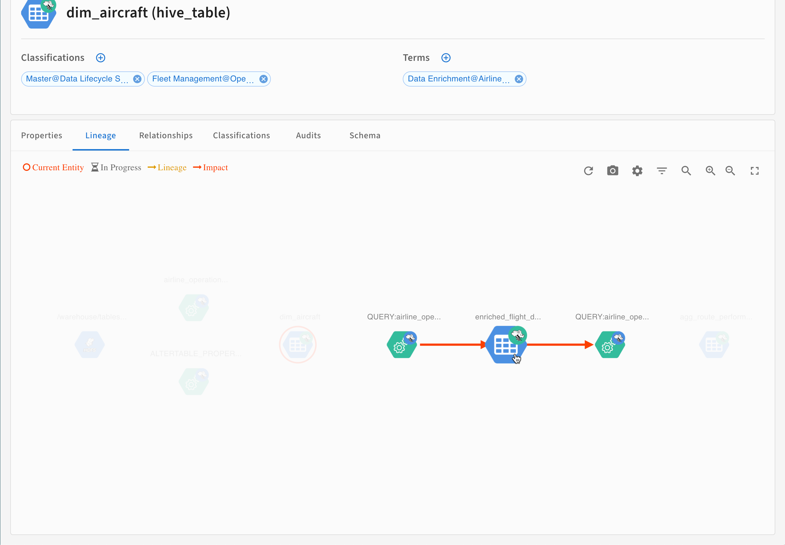 Impact | Connects the current entity with entities that could have an impact if data or schema information is changed in the current entity. Entities connected with red lines are descendants of the current entity. |