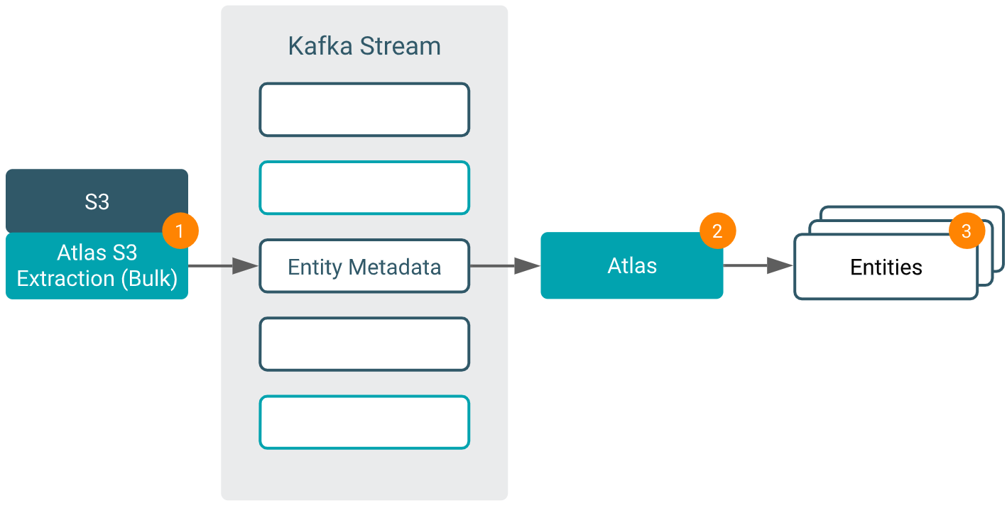 1. The bulk S3 extractor collects metadata from S3 and publishes it on a Kafka topic.