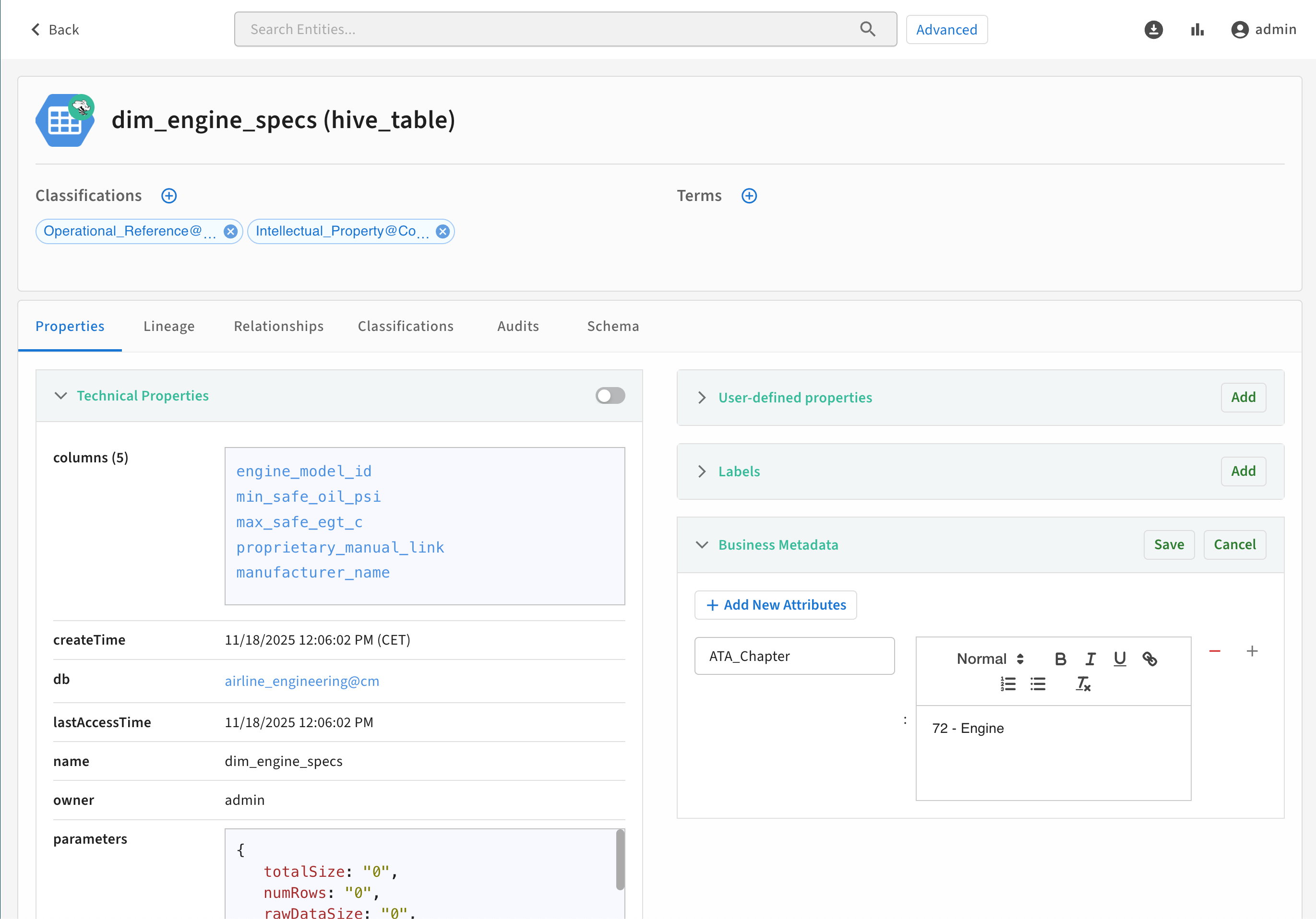 Assign Business Metadata attributes to entities in the entity detail page.
