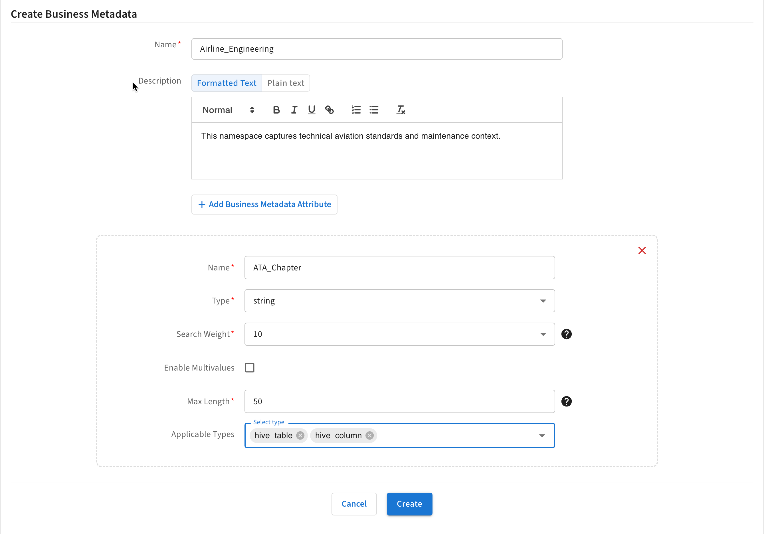 Create Business Metadata collections from the Administration page to add custom, structured attributes (Key-Value pairs) to assets without altering the underlying data schema.