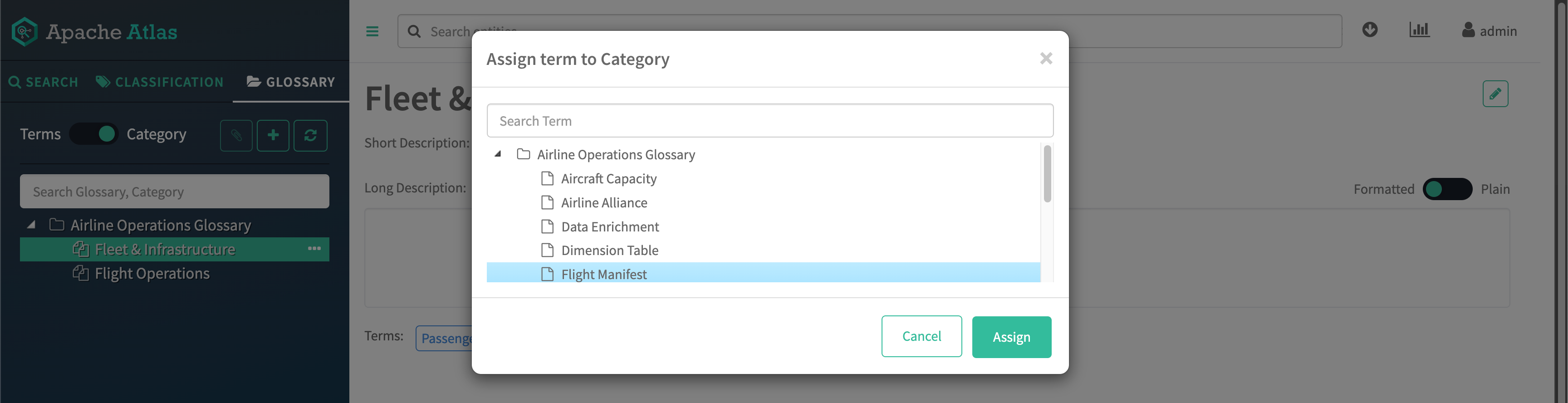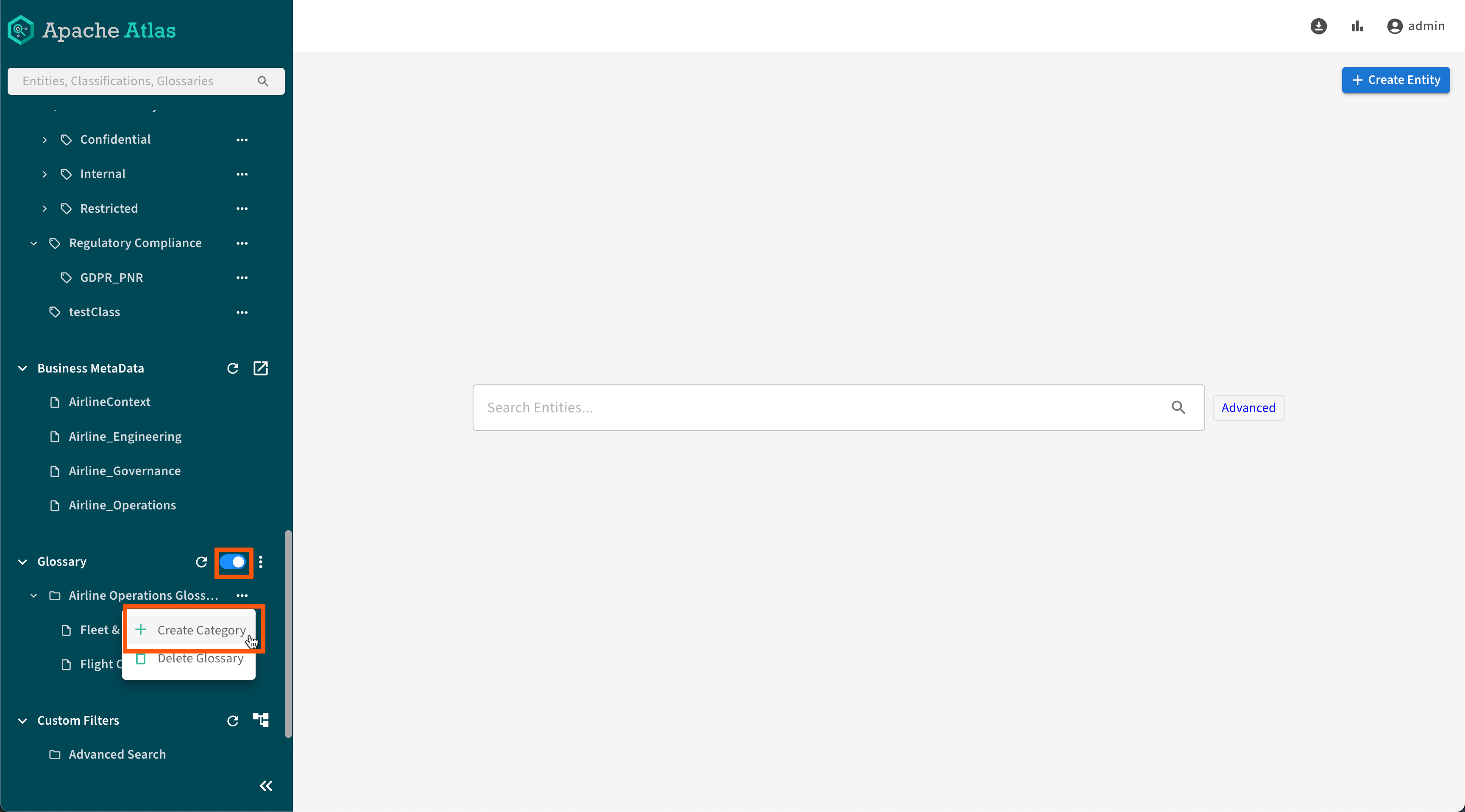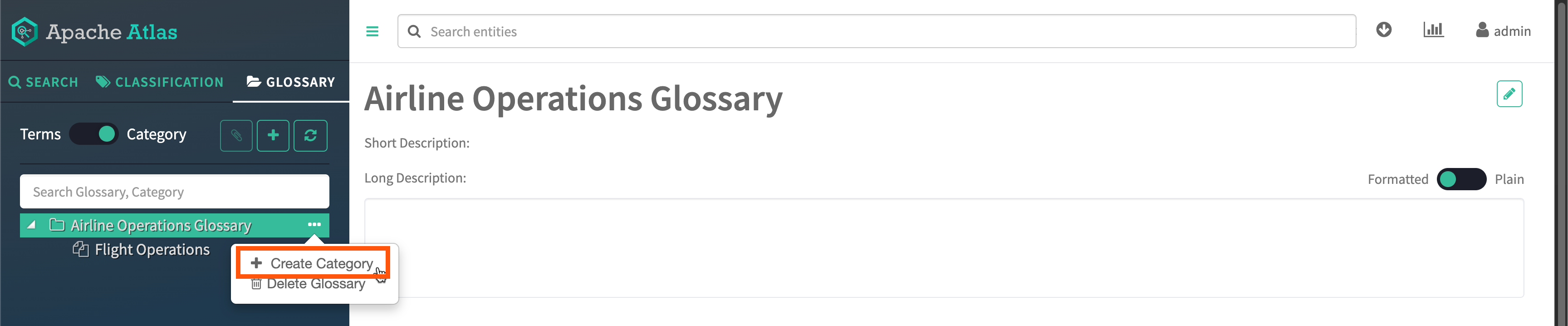Create a glossary category by switching the toggle to Category,