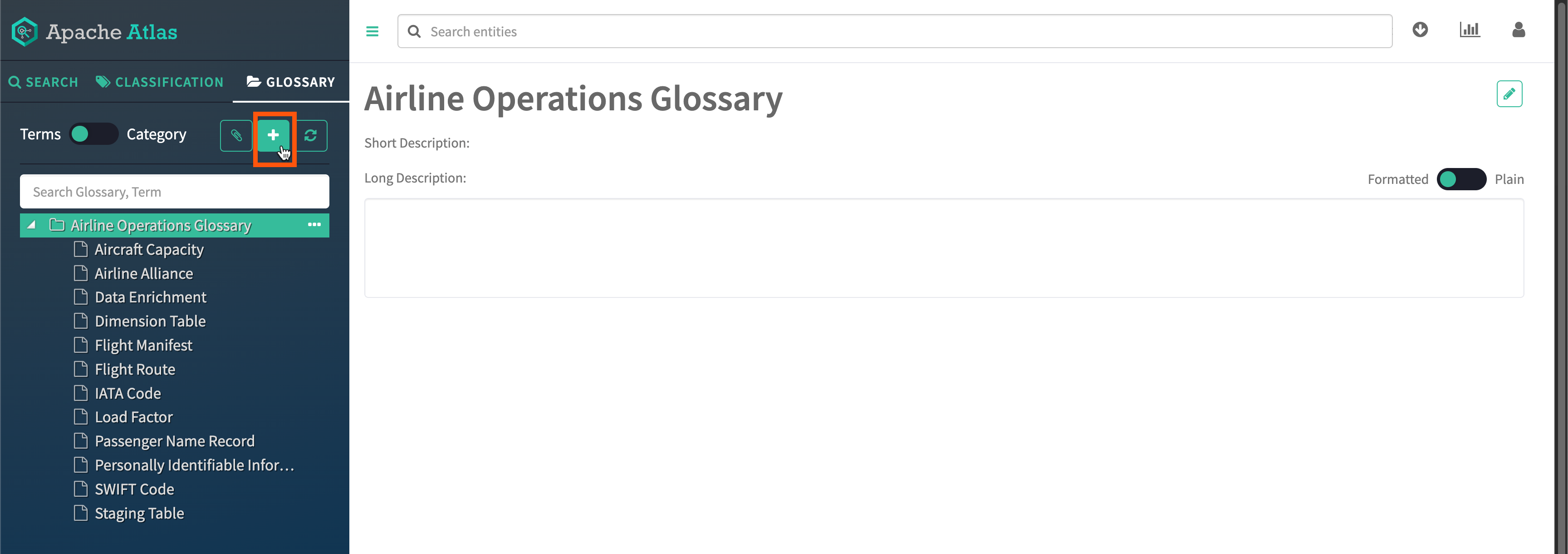1. Create a new glossary from the Glossary tab in the left navigation pane: