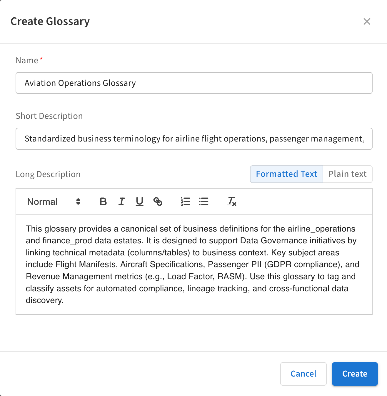 2. Enter the glossary name and descriptions, then click Create.