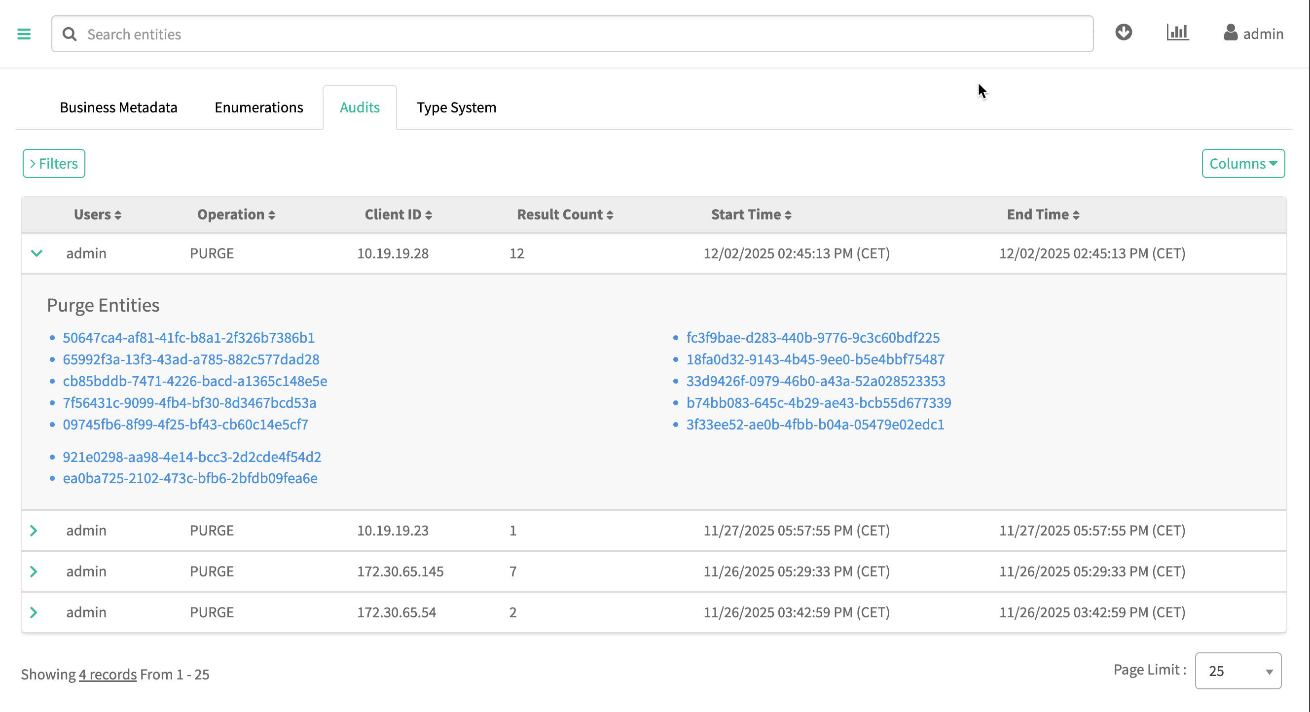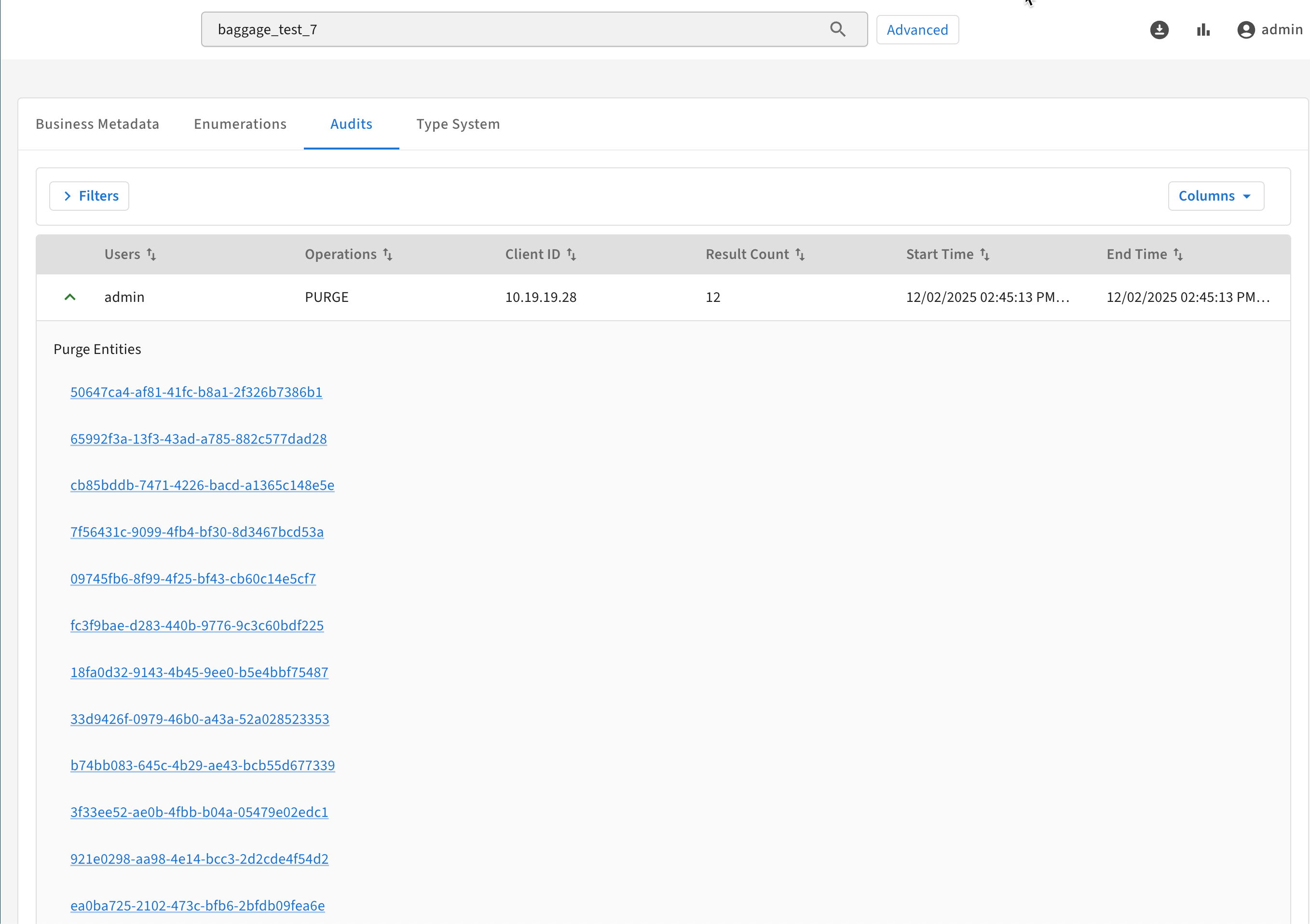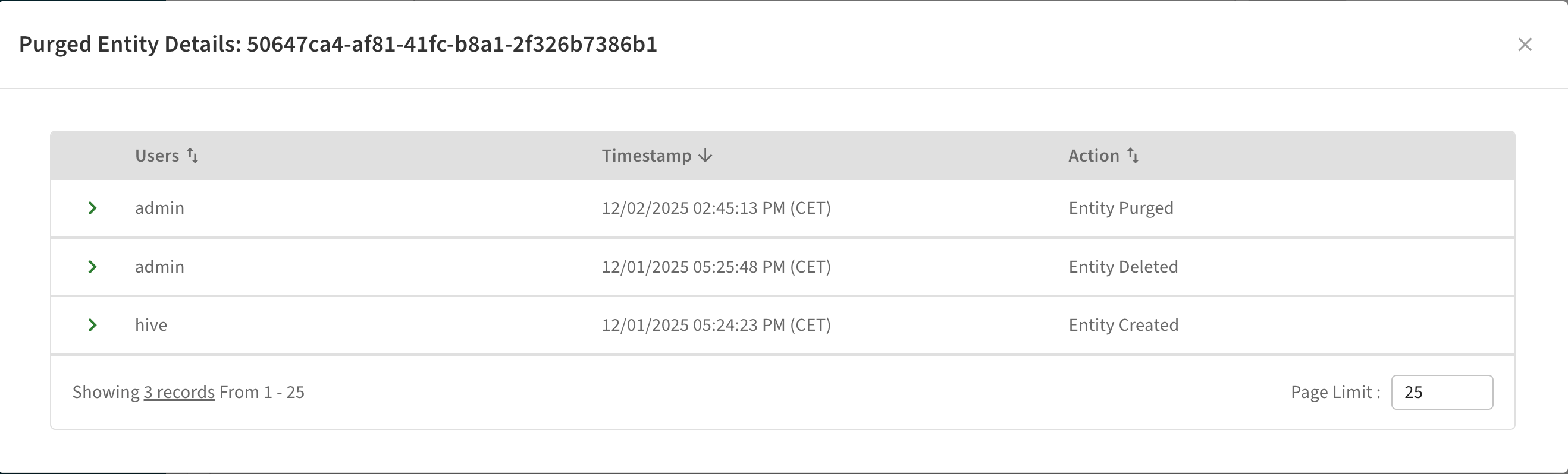 - Open a purge audit entry to show a list of GUIDs that were purged.