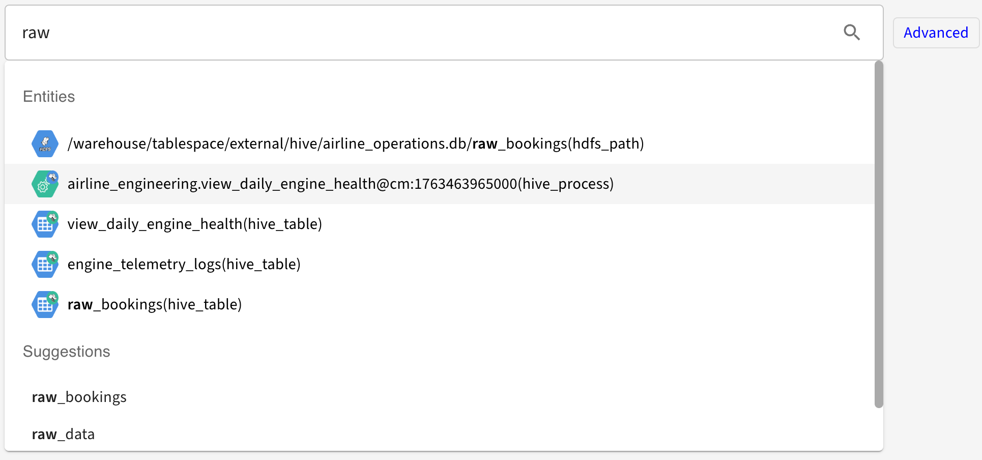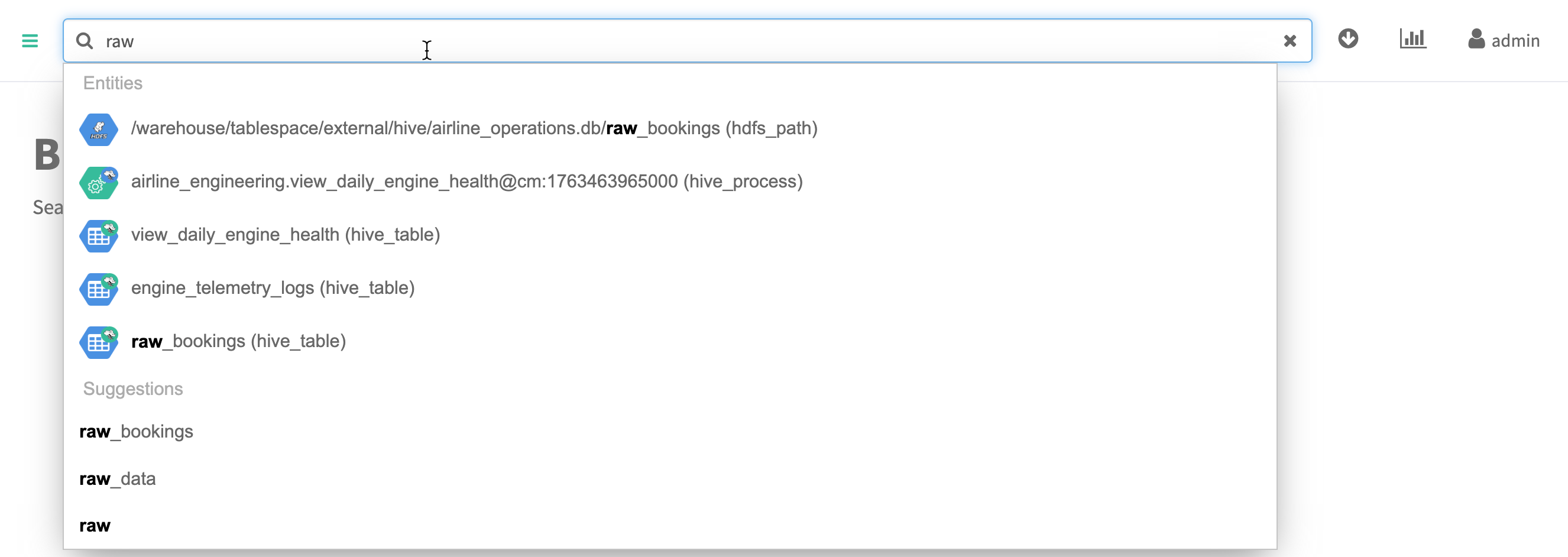 Apache Atlas builds a ranked index of metadata values so you can search for values across all metadata.