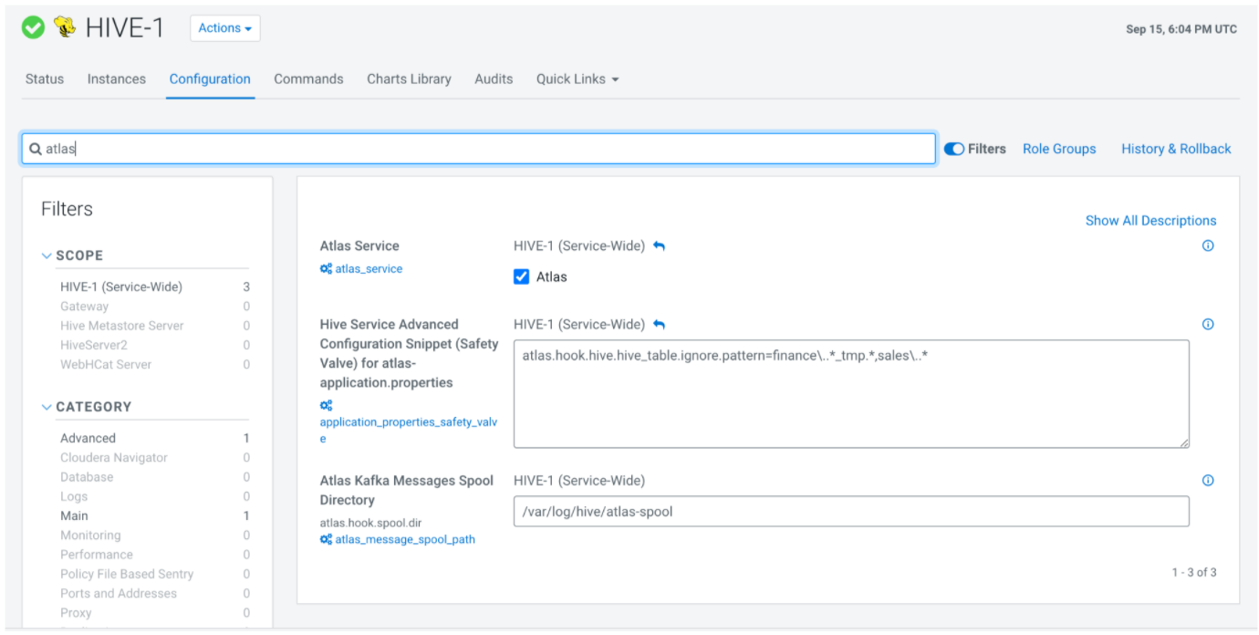 For example, if all tables in the ‘sales’ database and the tables that contain ‘_tmp’ in the ‘finance’ database should be ignored, the property can be set as follows in your Cloudera Manager instance.