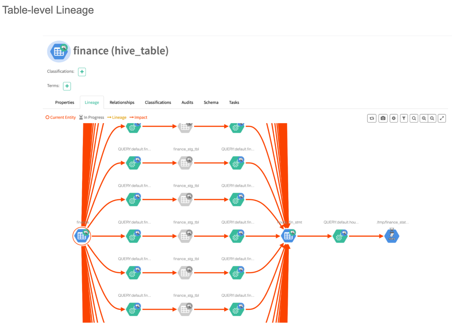 For example, in the below images, the finance table contains 333 columns (column names blurred) and the staging tables are created frequently by running an “INSERT OVERWRITE TABLE” query on the finance table. Processing is executed on the data in staging tables and later the staging tables are deleted as observed in the table level lineage diagram.