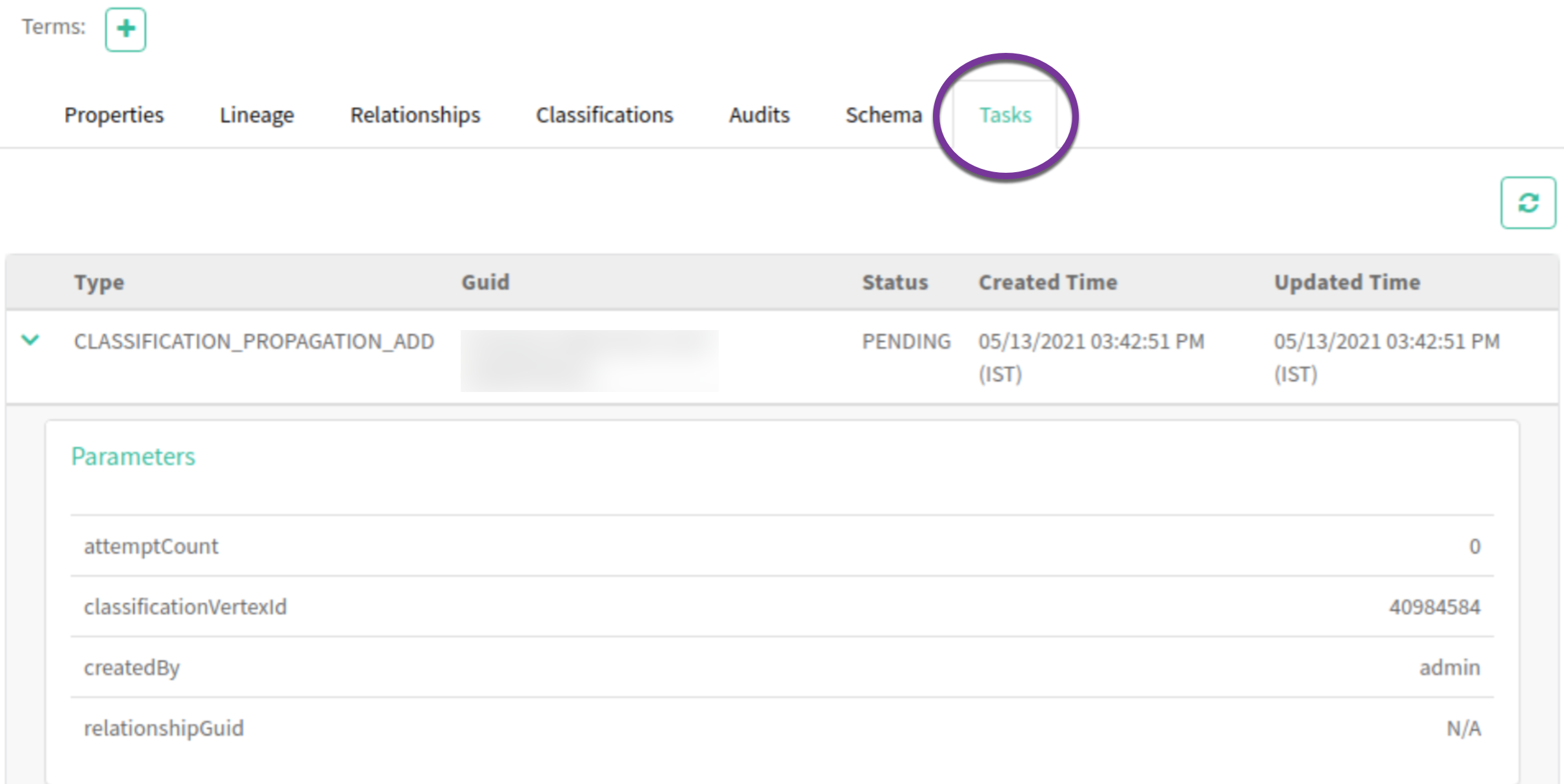 While the background task is processing the tag propagation request, you can view the notification of propagation of tags in the Atlas UI on the Entities details page. The Task tab displays the progress of this request.