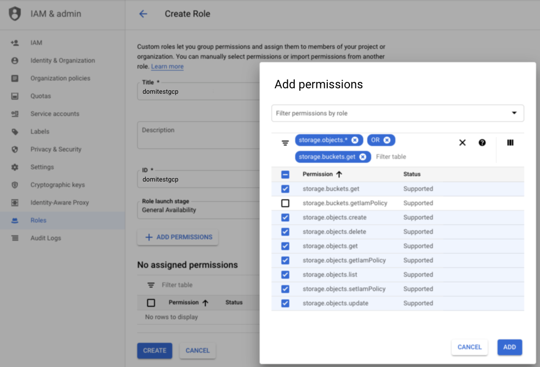 Specific permissions are required for the Google Cloud Storage Connector to access buckets. This set of permissions is the combination of the permissions associated with the existing Google Cloud IAM Role called "Storage Object Admin" and the Google Cloud IAM Permission called "storage.buckets.get".