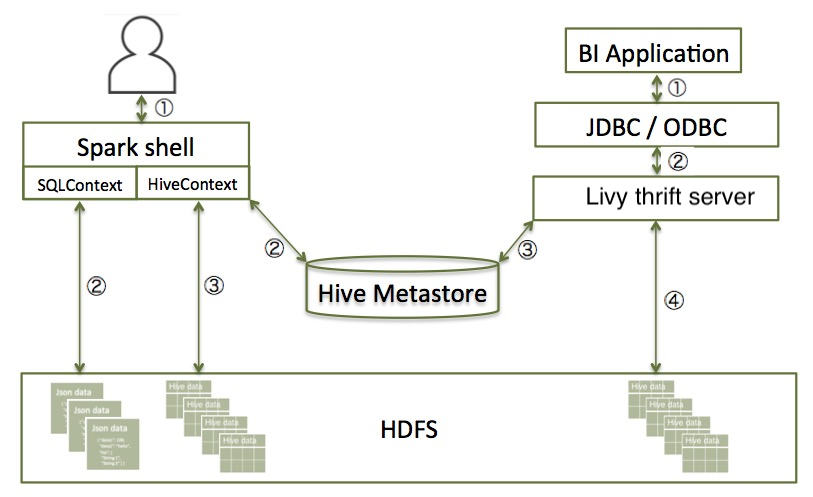 The following diagram illustrates the access process, depending on whether you are using the Spark shell or business intelligence (BI) application: