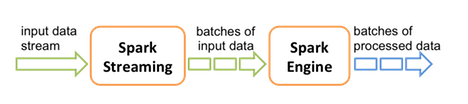 Spark Streaming receives live input data streams and divides the data into batches, which are then processed by the Spark engine to generate the final stream of results in batches: