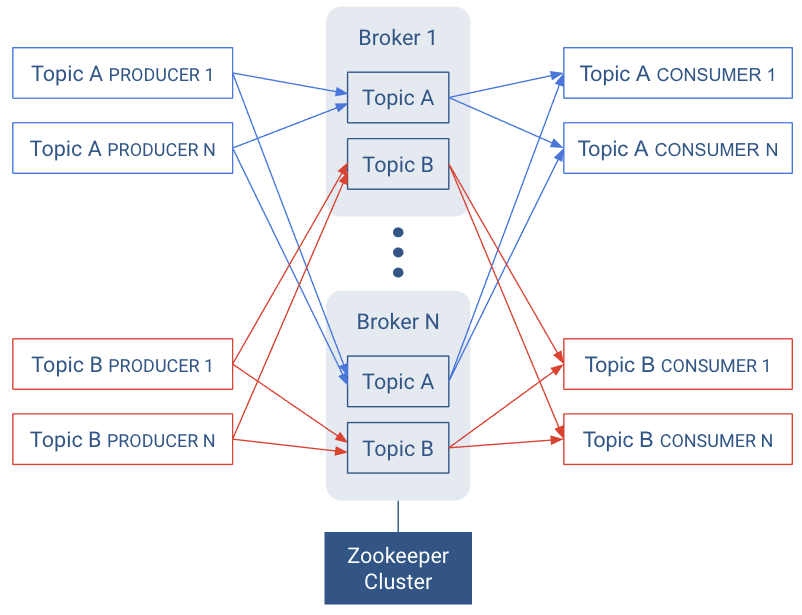 Kafka is a distributed system that implements the basic features of an ideal publish-subscribe system. Each host in the Kafka cluster runs a server called a broker that stores messages sent to the topics and serves consumer requests.