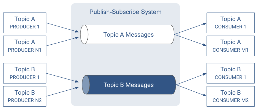 In any publish-subscribe system, messages from one publisher, called producers in Kafka, have to find their way to the subscribers, called consumers in Kafka. To achieve this, Kafka introduces the concept of topics, which allow for easy matching between producers and consumers.