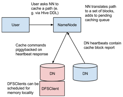 In a centralized cache management, the NameNode is responsible for coordinating all of the DataNode off-heap caches in the cluster. The NameNode periodically receives a cache report from each DataNode. The cache report describes all of the blocks cached on the DataNode. The NameNode manages DataNode caches by piggy-backing cache and uncache commands on the DataNode heartbeat.
