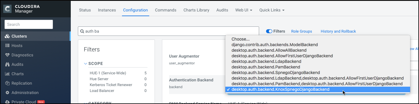 - Go to Clusters > Hue service > Configurations and search for the Authentication Backend field.