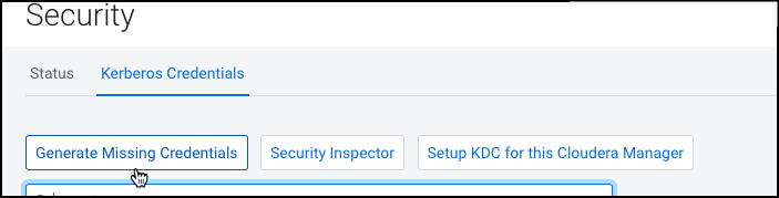 Role is missing Kerberos keytab. Go to the Kerberos Credentials page and click the Generate Missing Credentials button. - Click Administration on the Cloudera Manager left navigation panel and select Security.